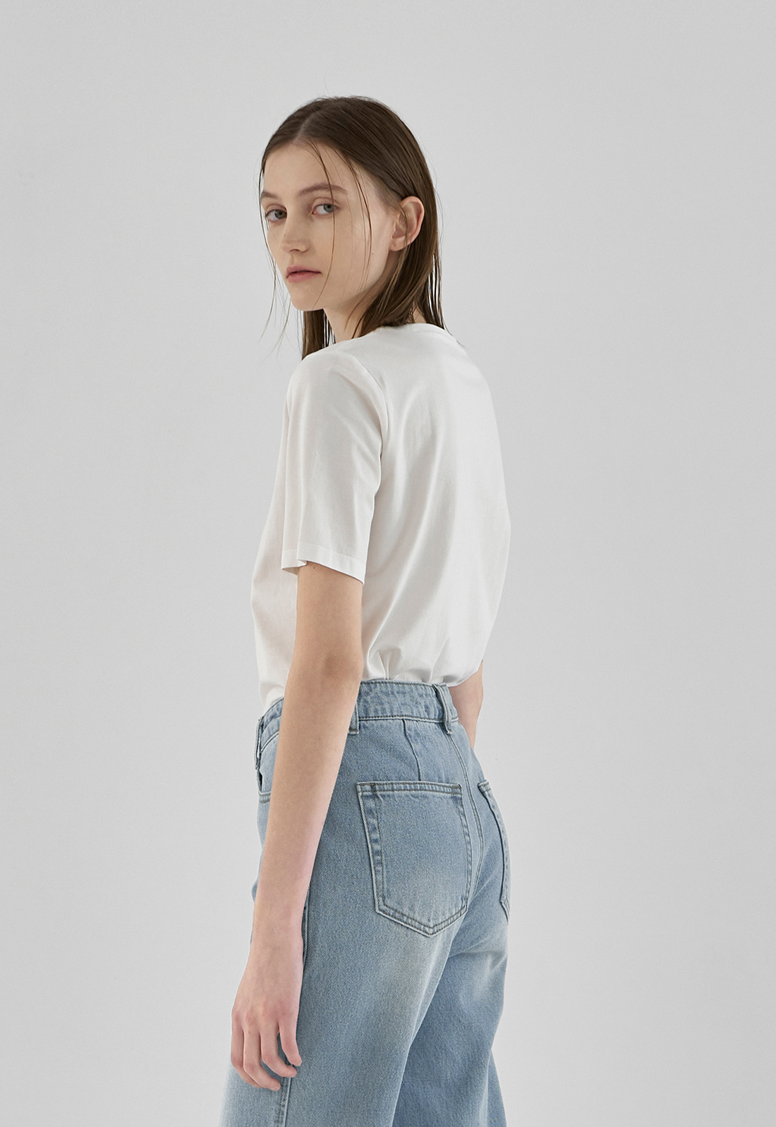 후로킹 레터링 티입니다. 후로킹 기법의 프린트로 포인트를 주었으며, 전체적으로 살짝 여유있는 실루엣으로 여성스러운 무드로 착용이 가능한 데일리 아이템입니다.