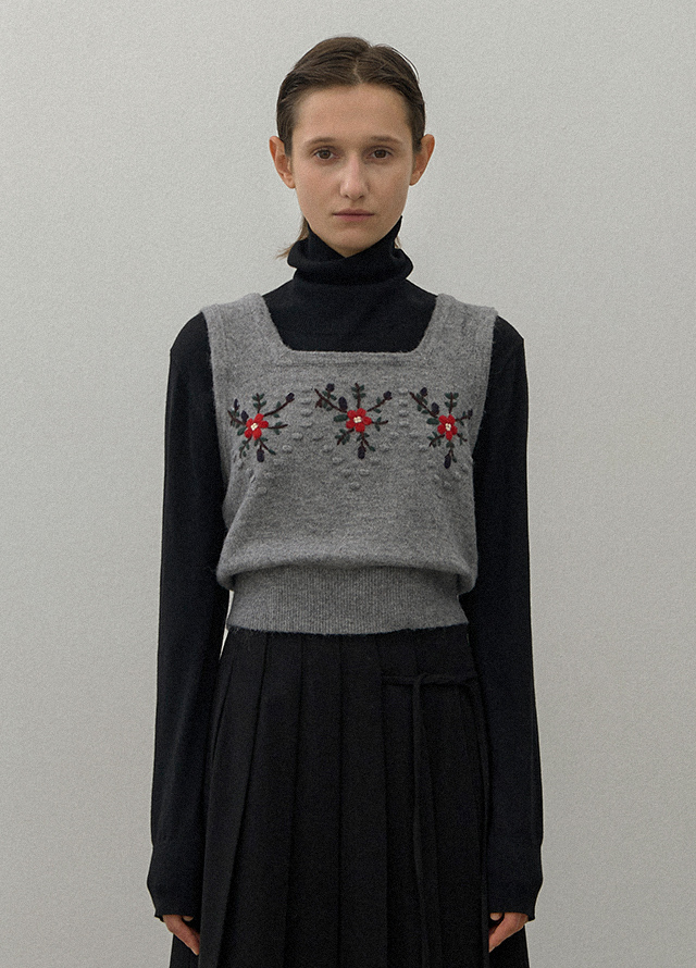 플라워 자수와 퐁퐁이 조직이 포인트인 스퀘어넥 니트 베스트입니다.