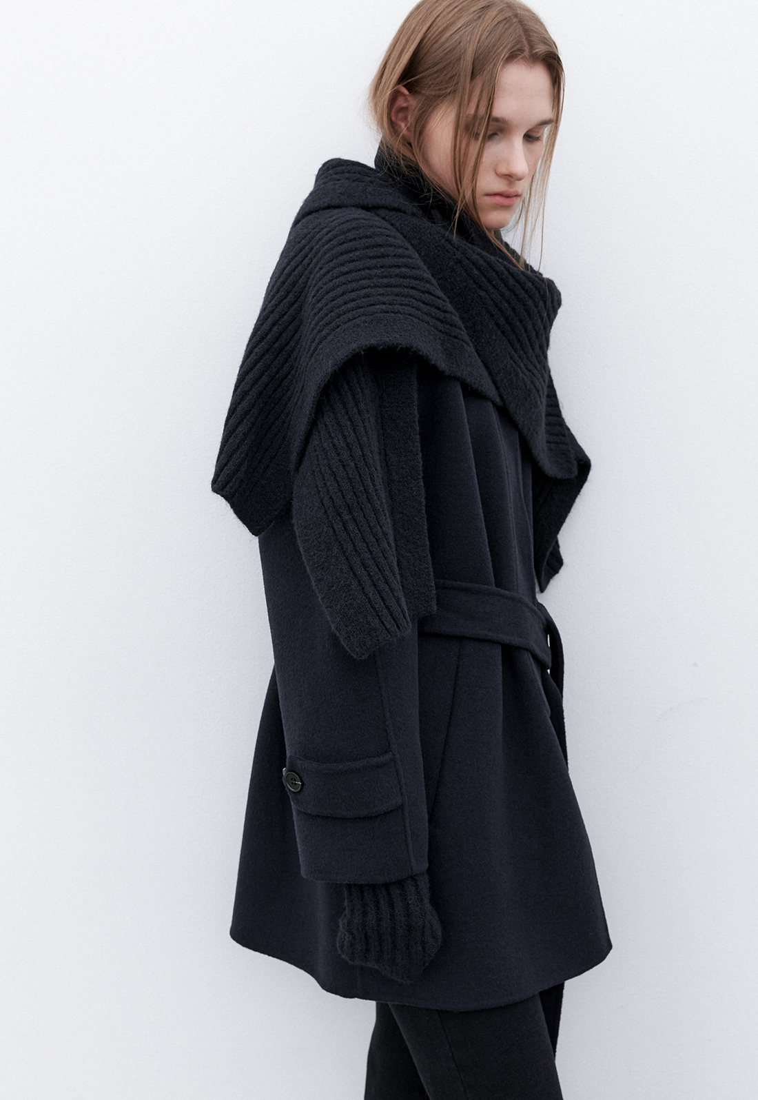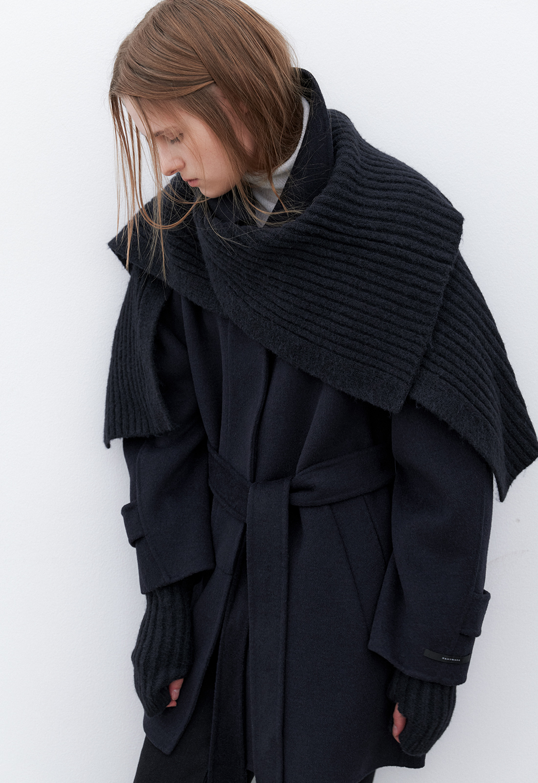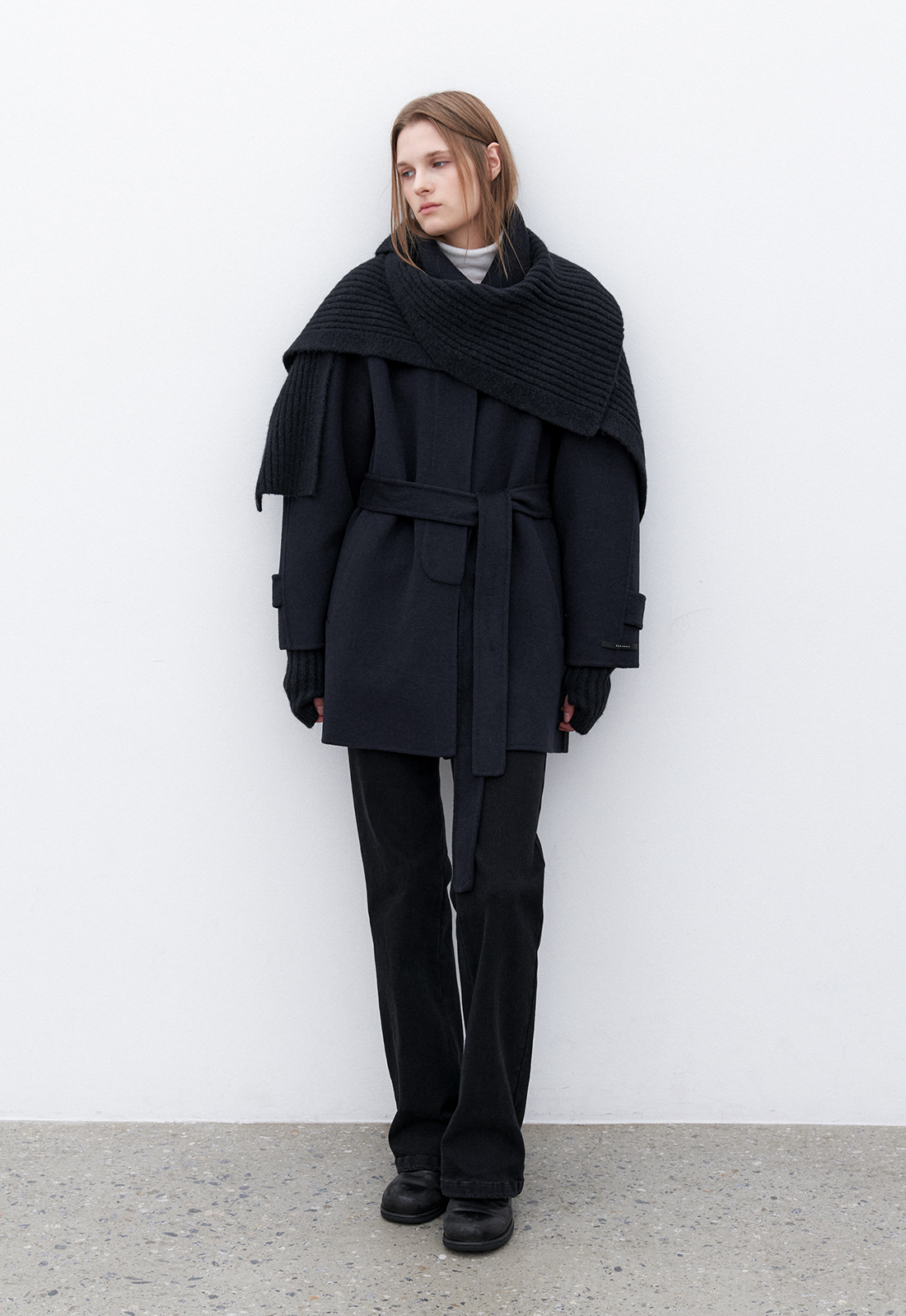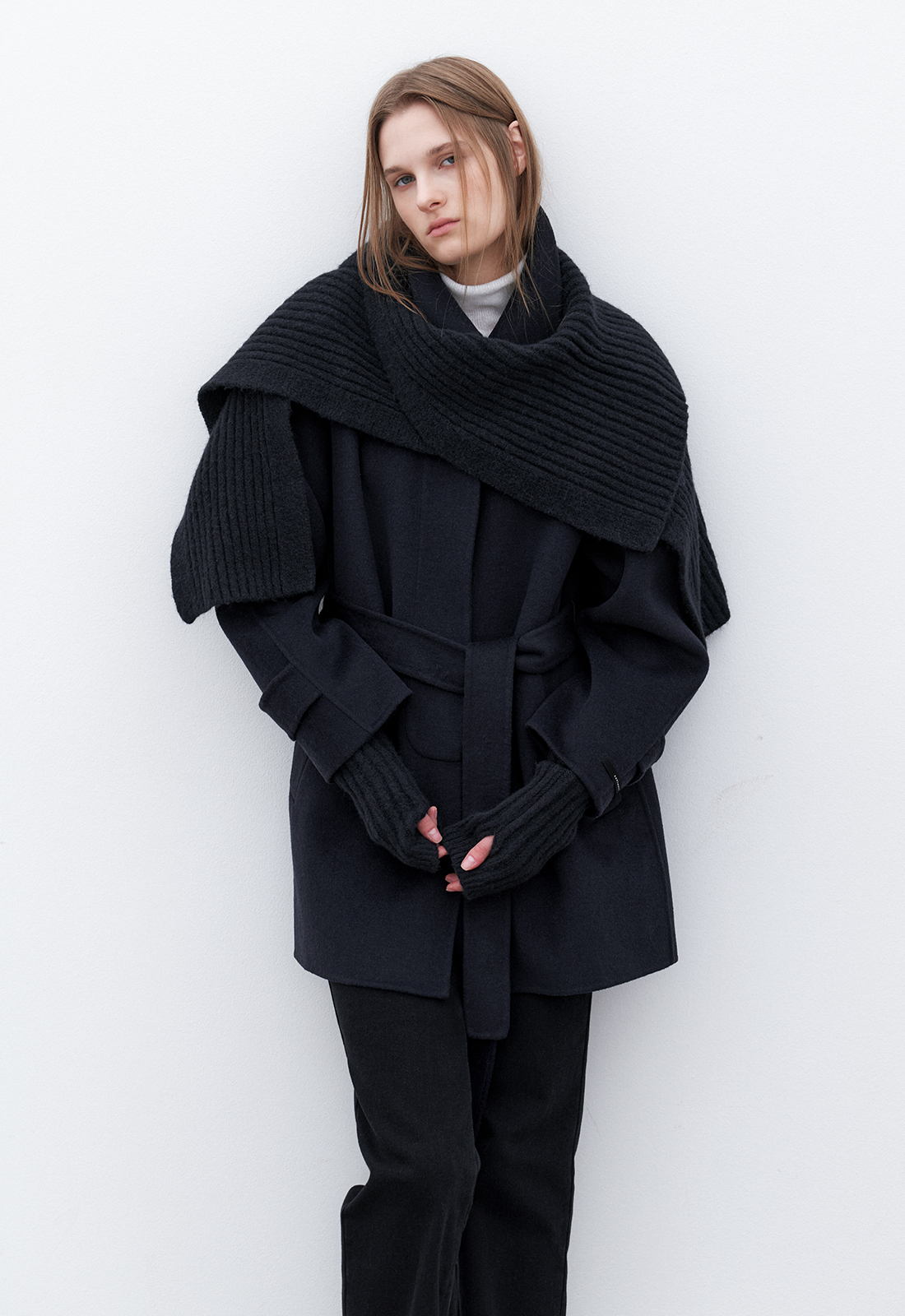 니트 머플러, 핸드 워머의 세트로 구성된 발마칸 디자인의 핸드메이드 하프 코트입니다.
