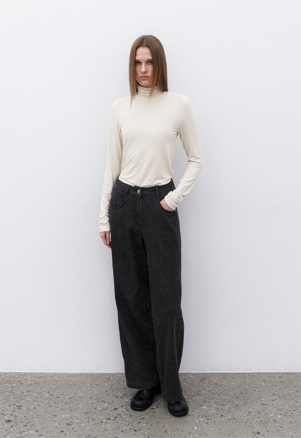 길이감 있는 목폴라로, 자연스러운 주름 형태로 스타일링하여