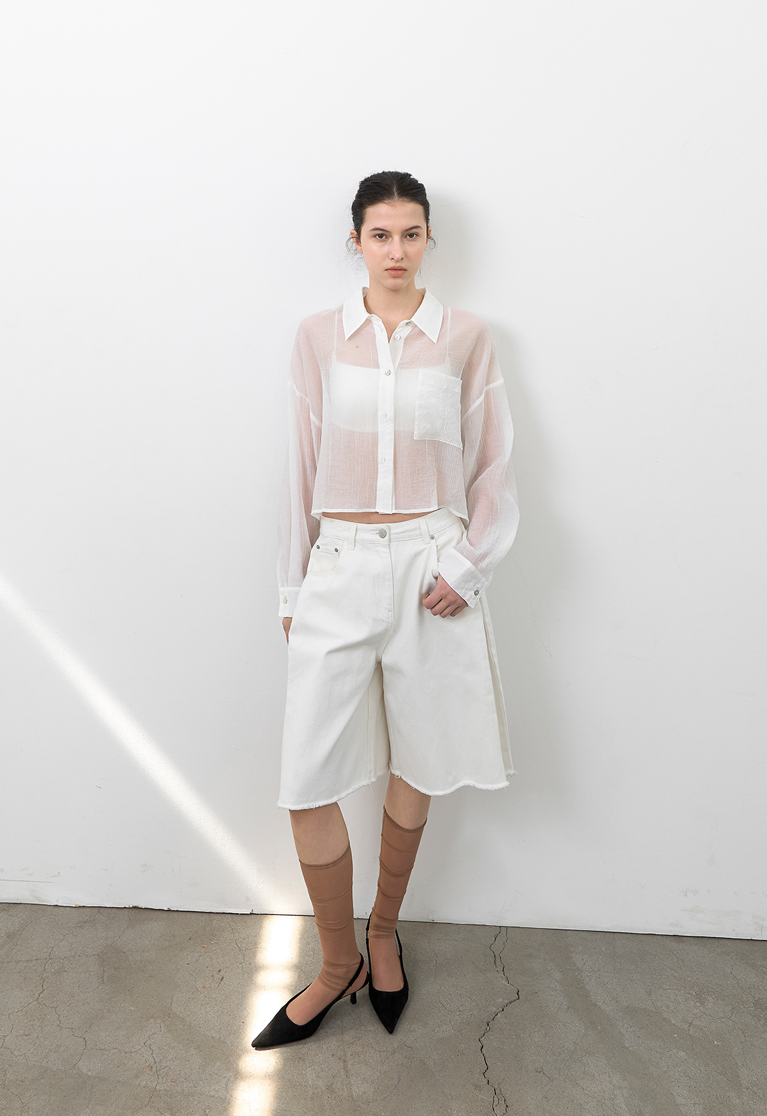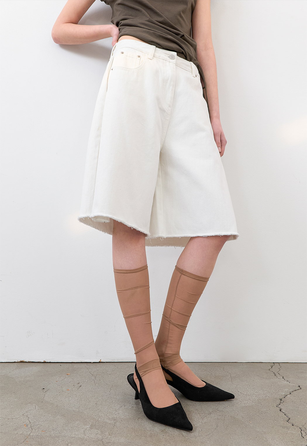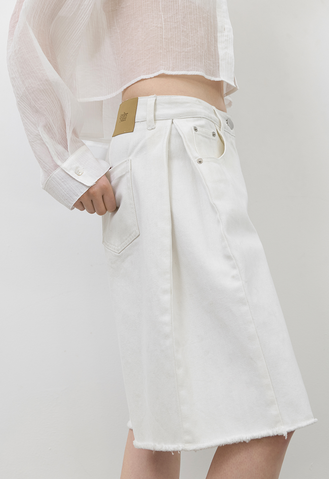 고시감 있는 화이트 데님과 사이드 턱 디테일이 어우러진