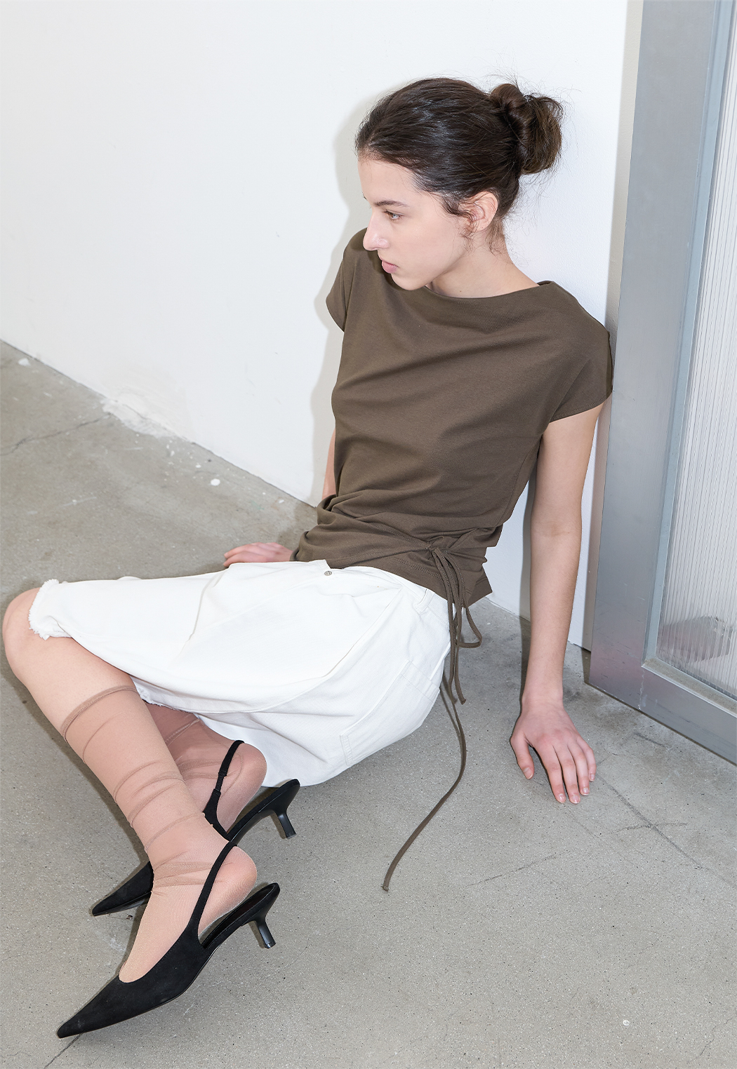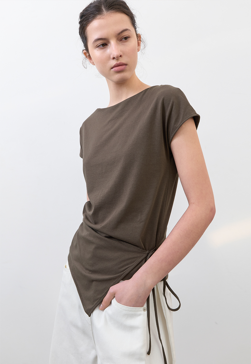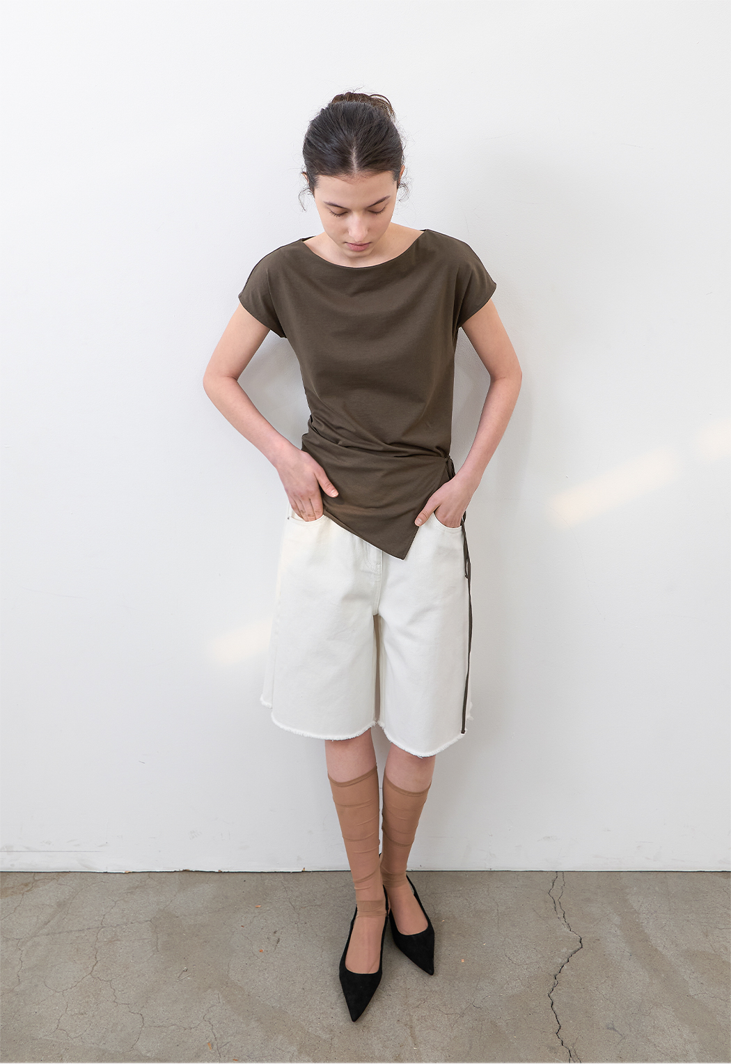 고시감 있는 화이트 데님과 사이드 턱 디테일이 어우러진