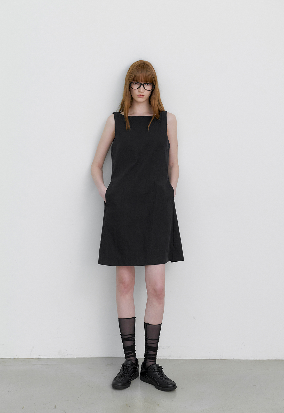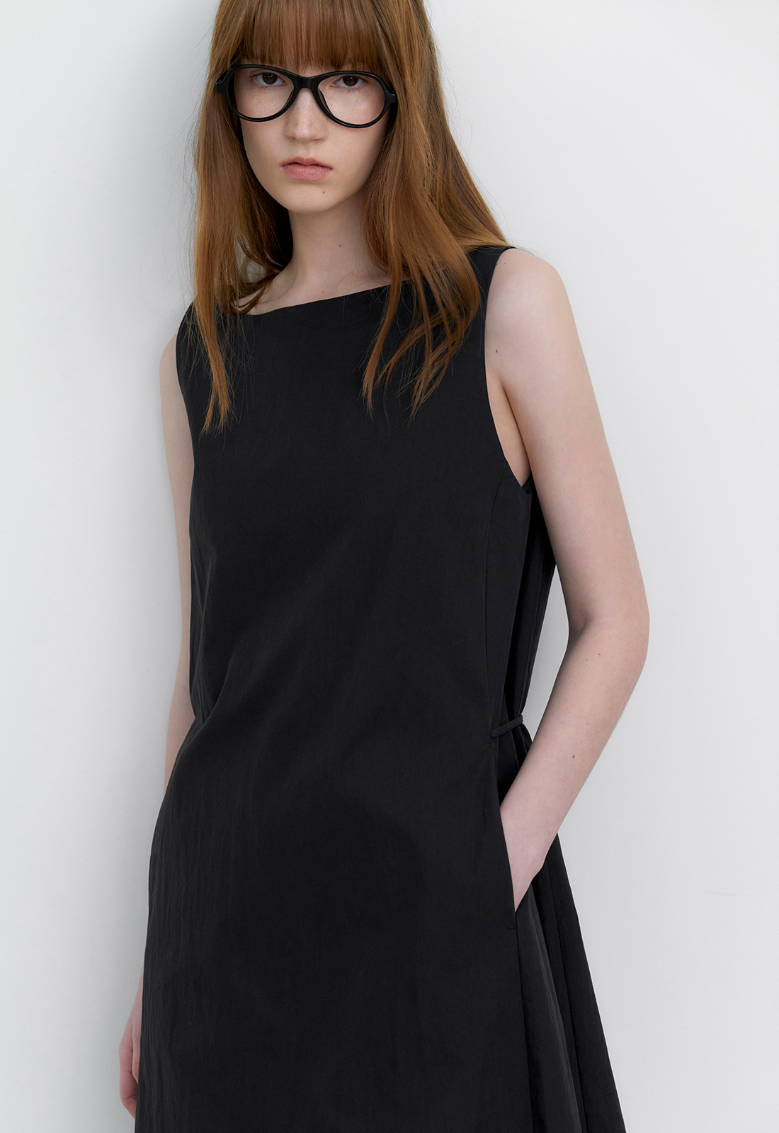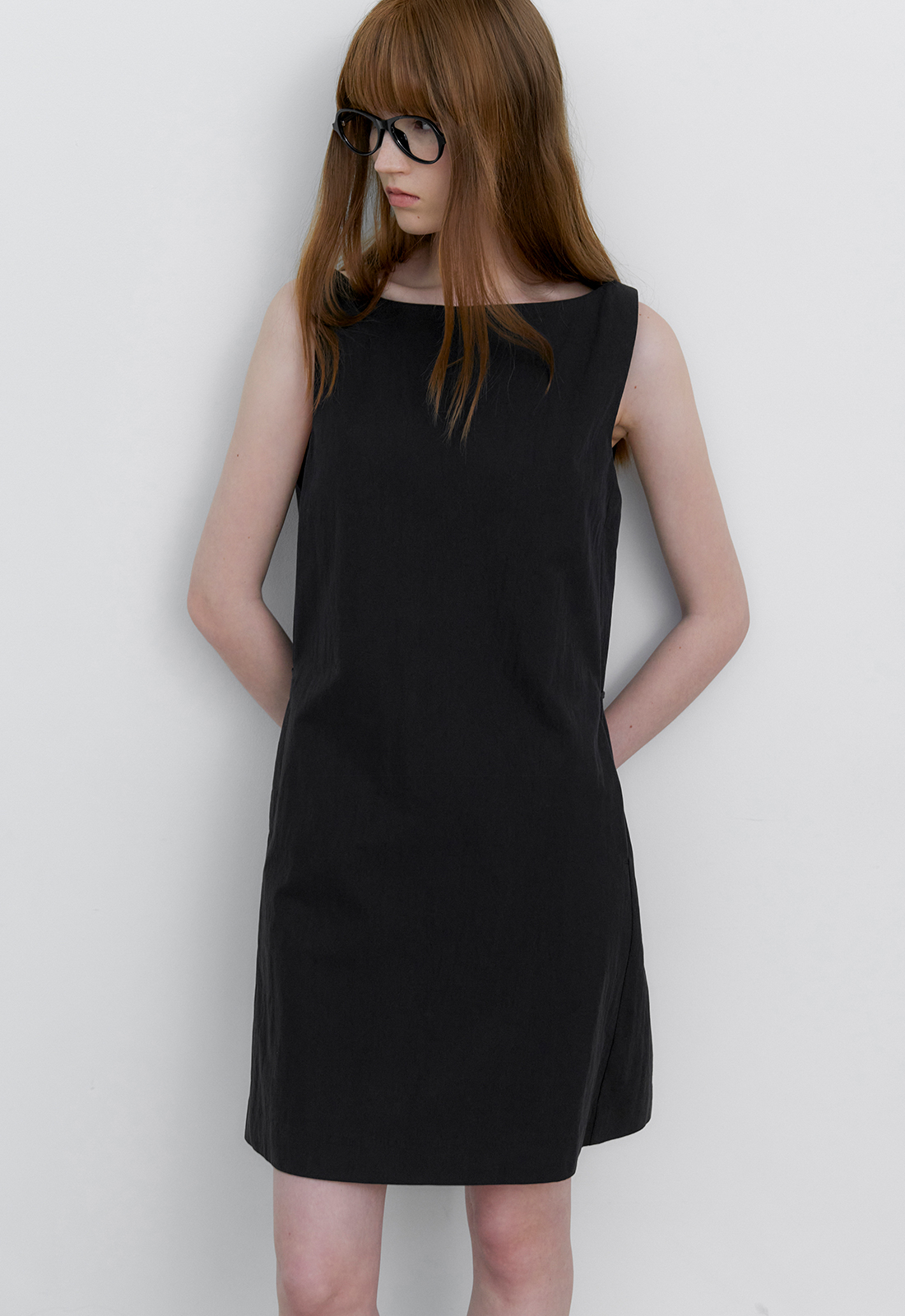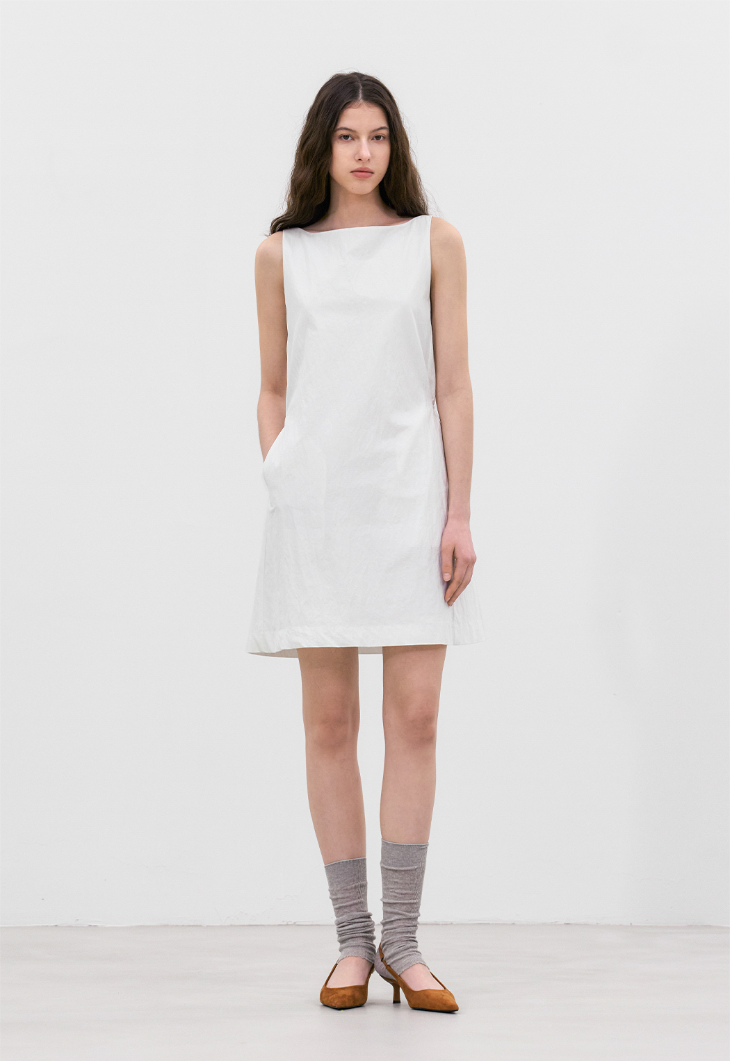 A라인의 미니멀 미디 원피스입니다.