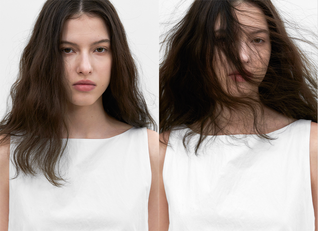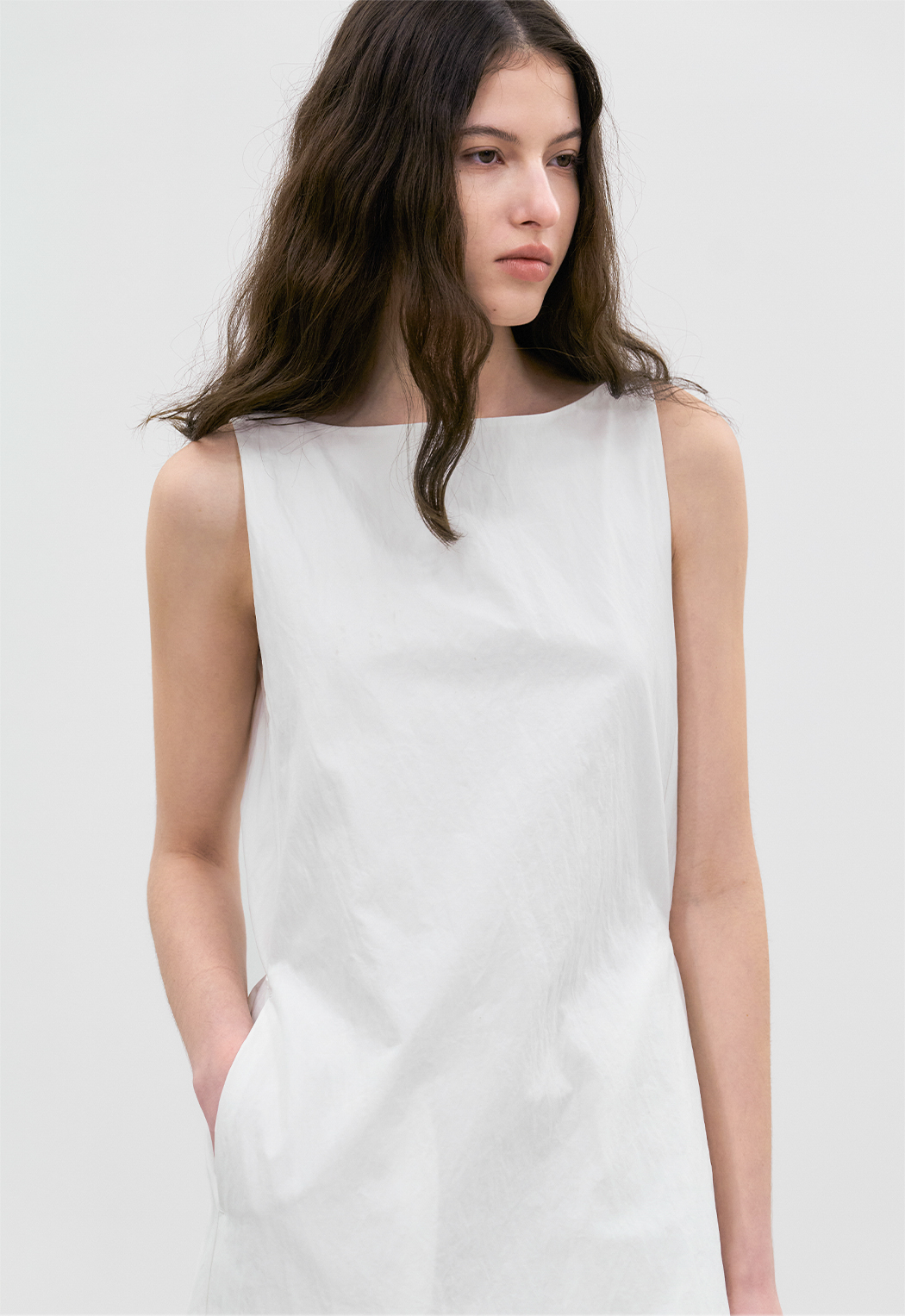 옆으로 넓은 모던 보트넥이 시원한 느낌을 줍니다.