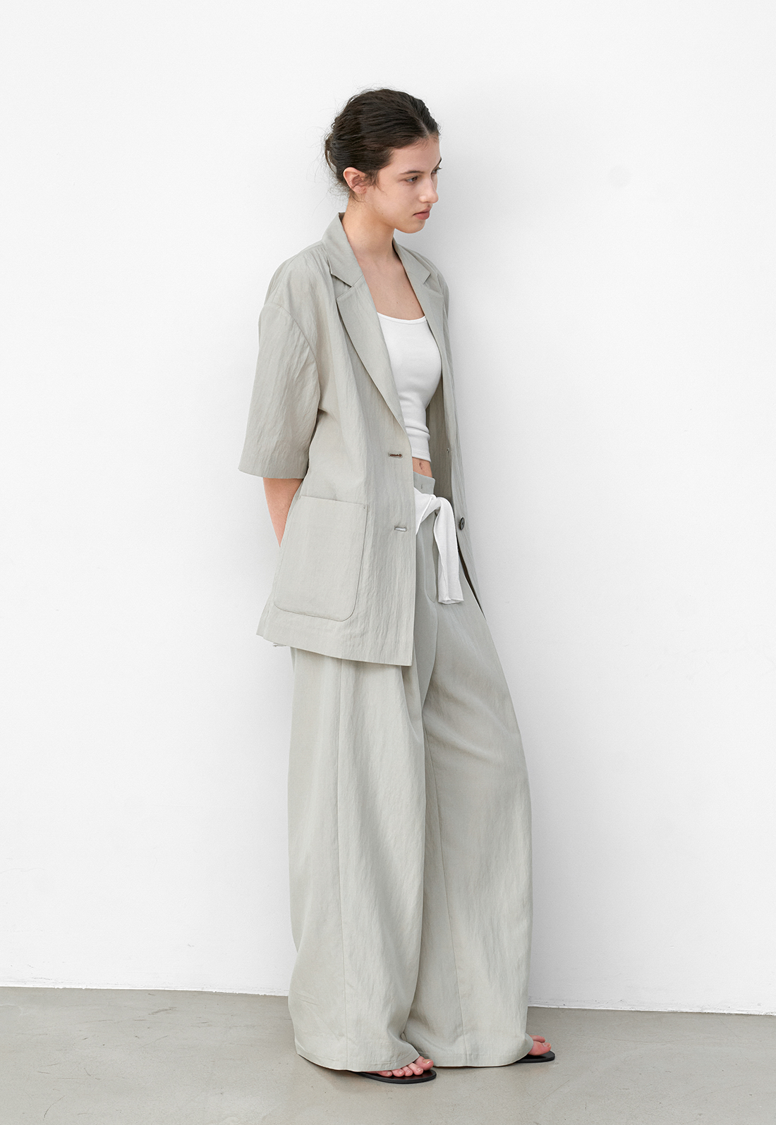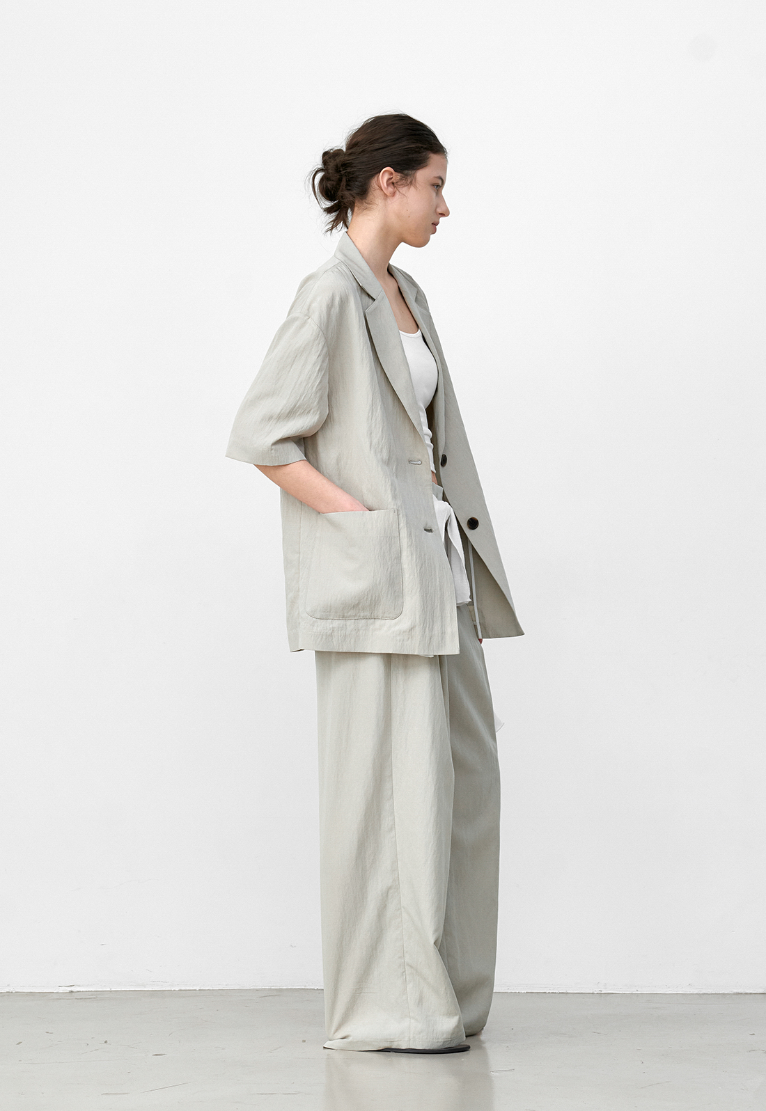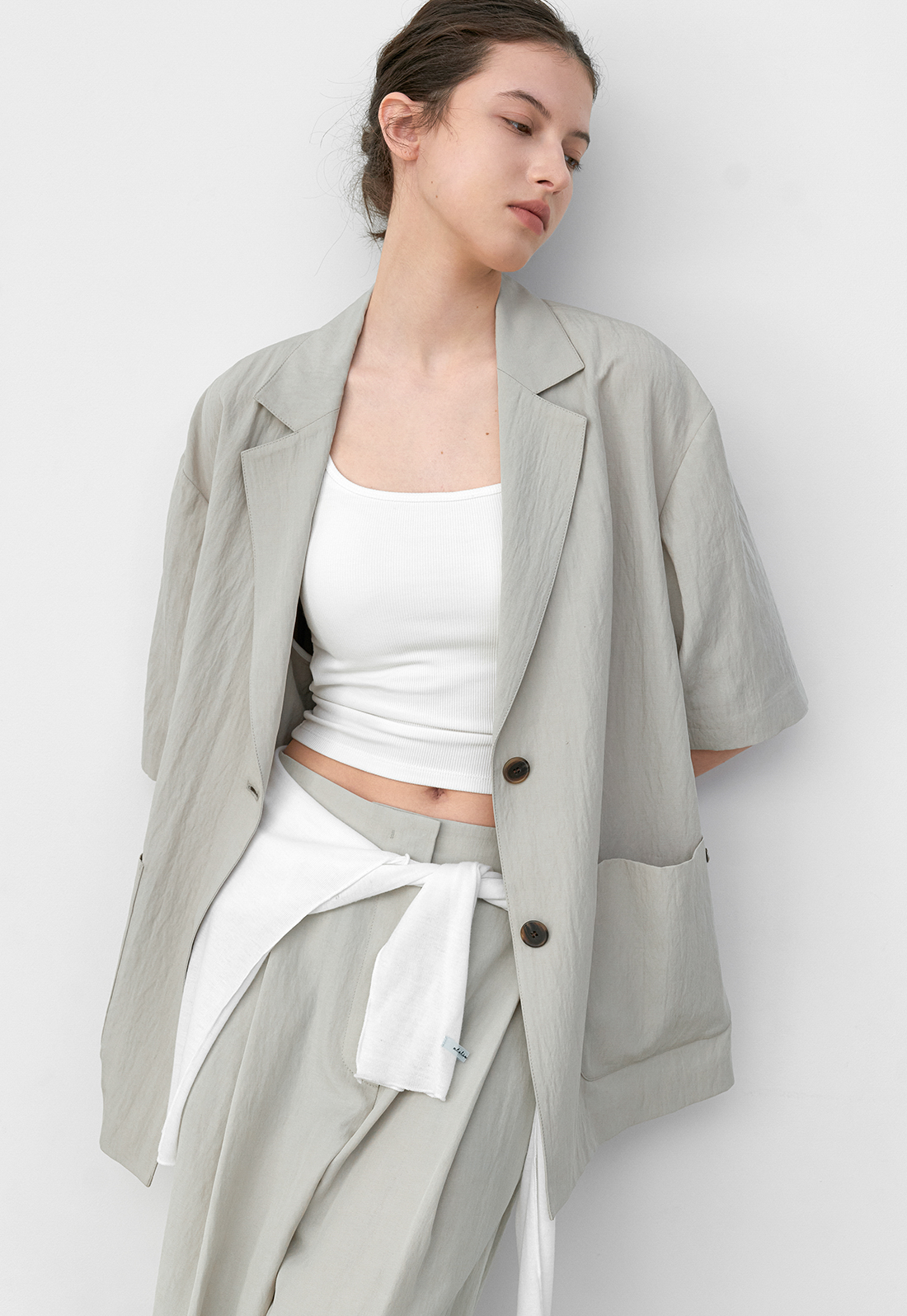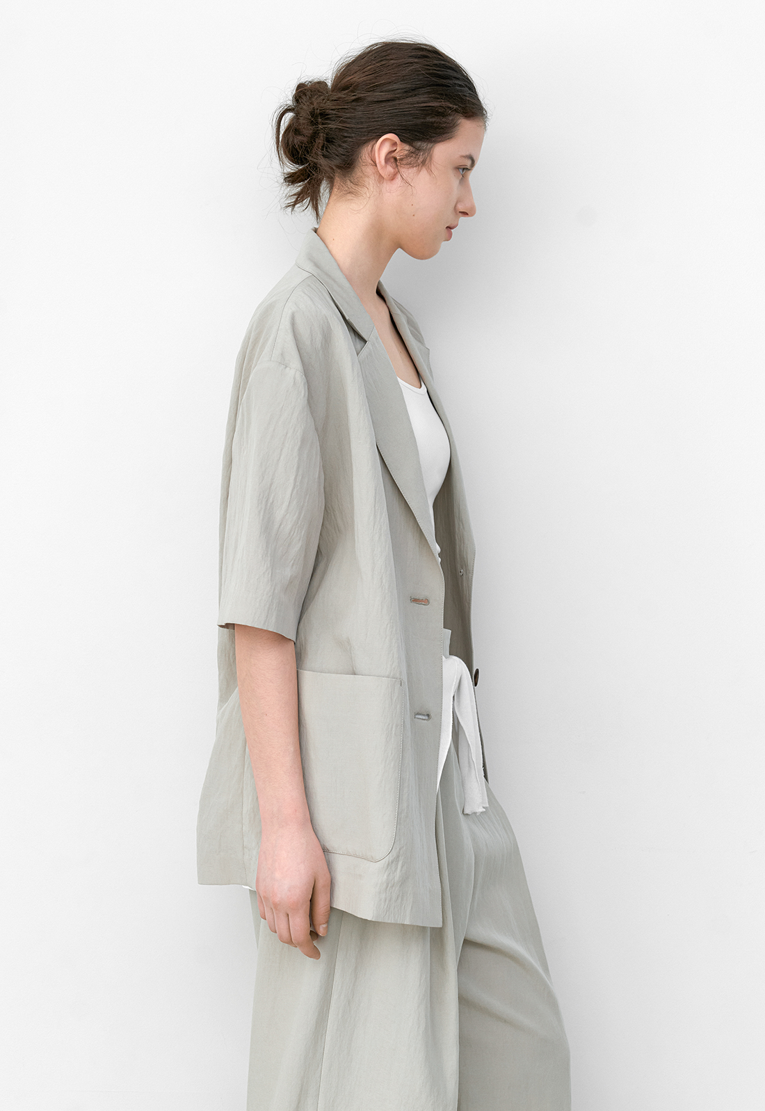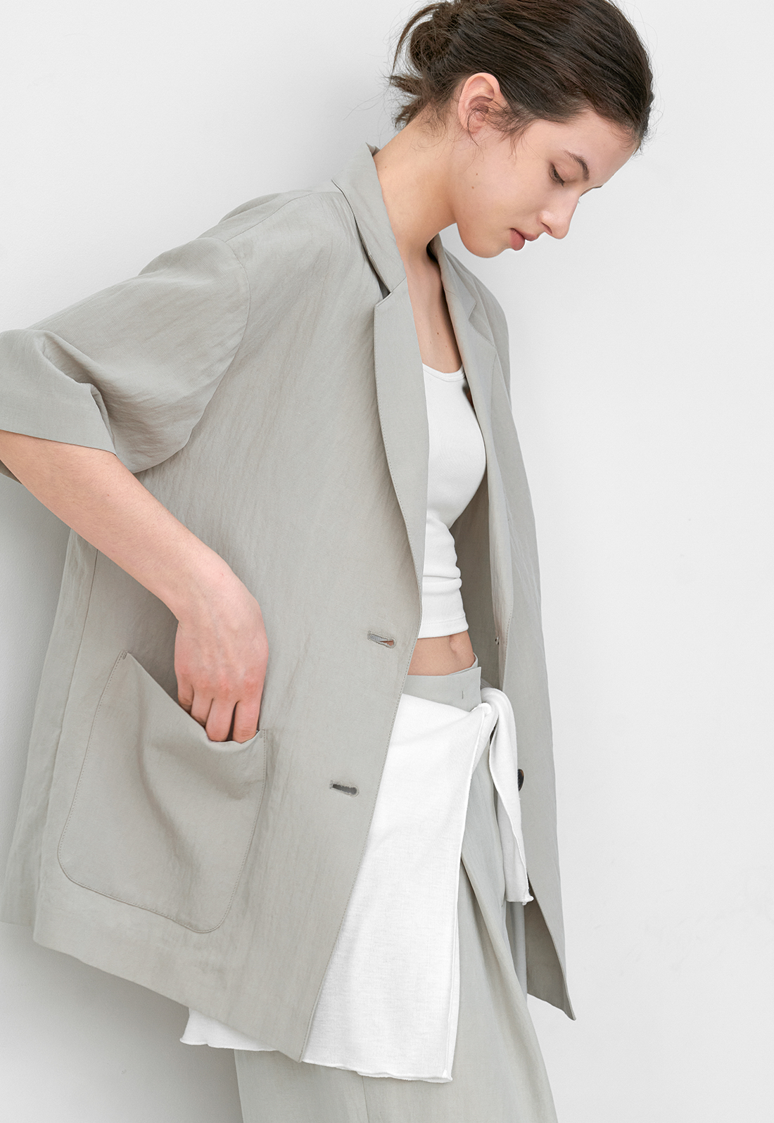 가볍게 흐르는 소재로 자연스러운 실루엣이 돋보이는 오버핏 자켓입니다.