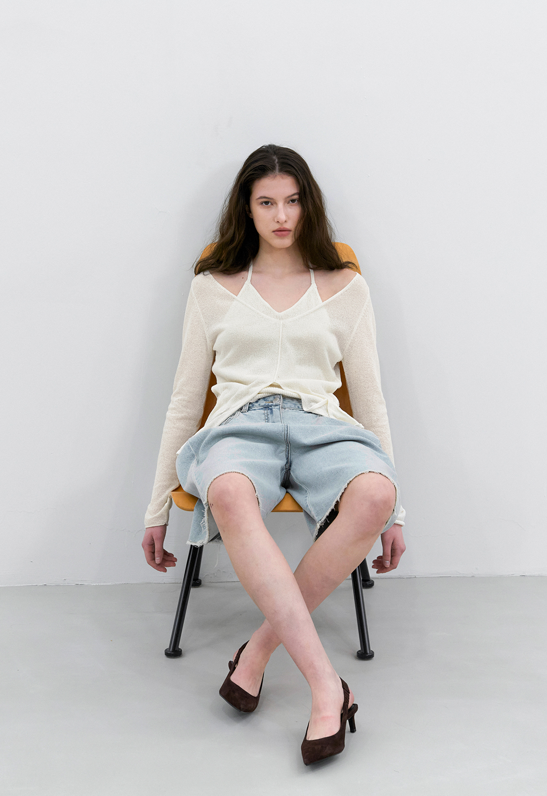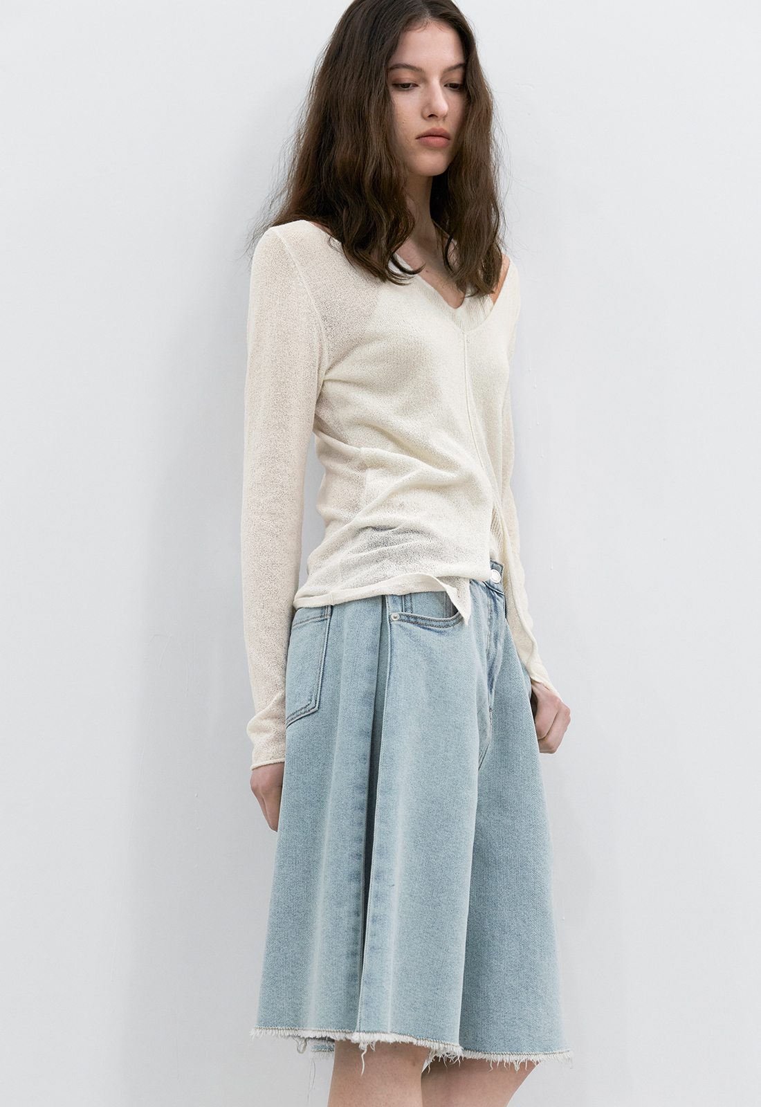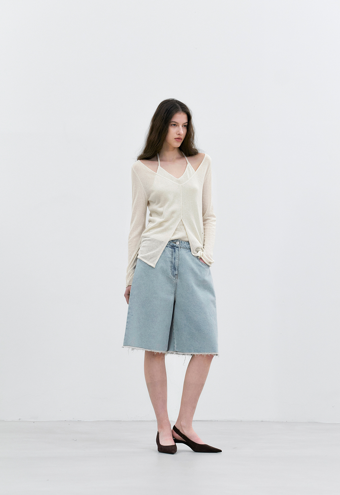 목과 어깨 라인을 자연스럽게 드러내 여리여리한 무드를 연출합니다.