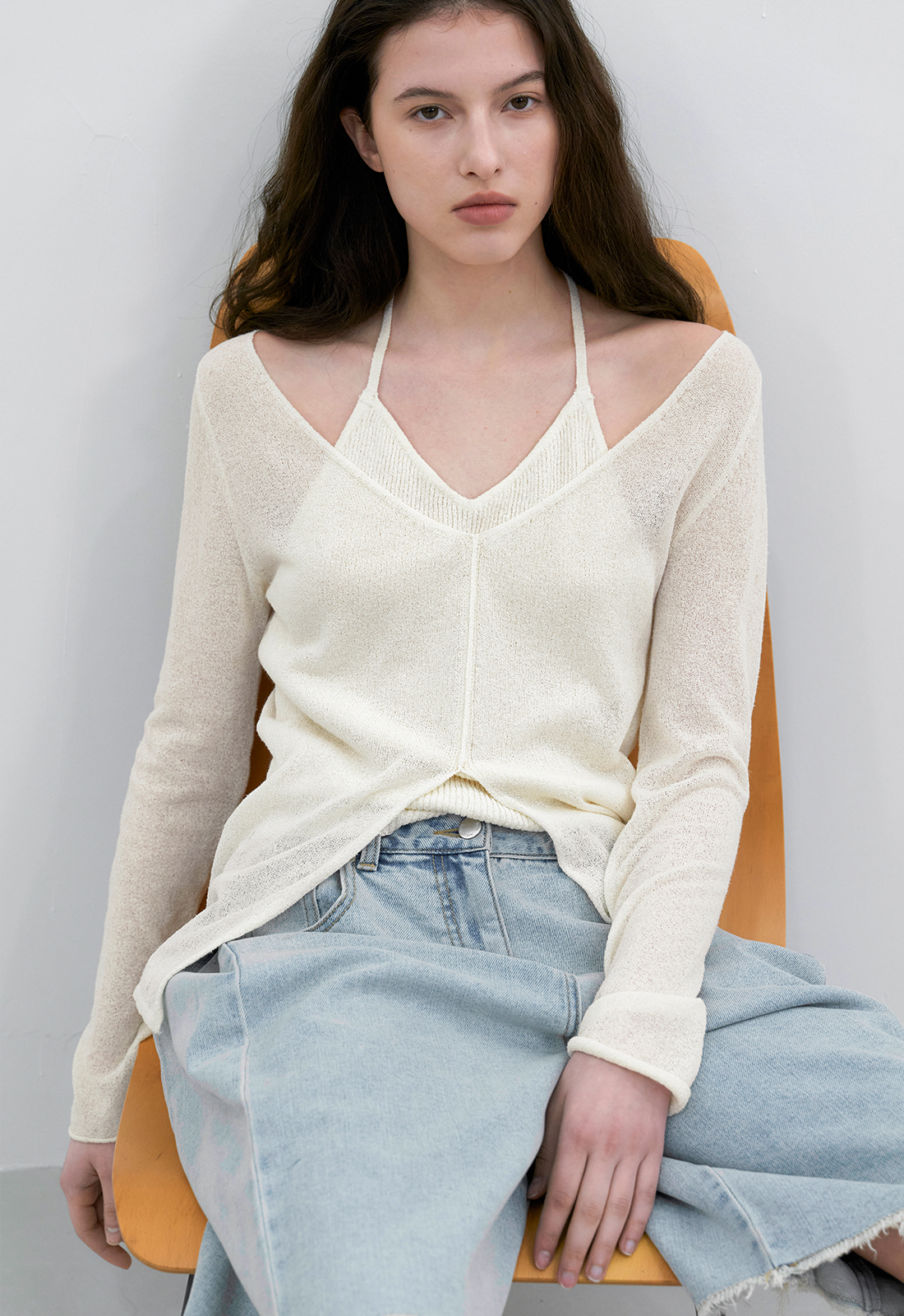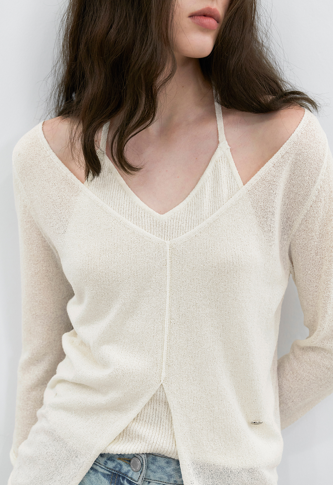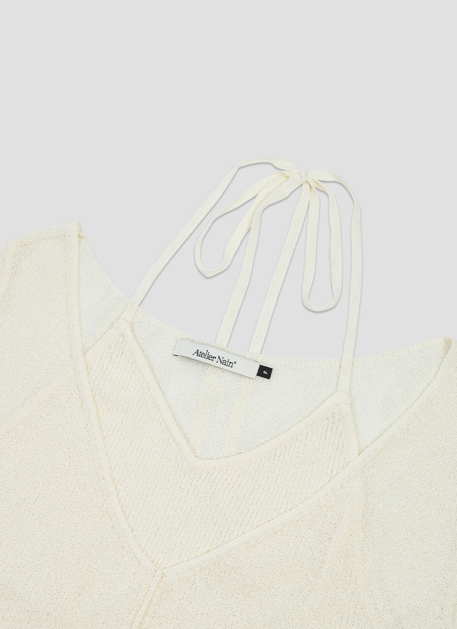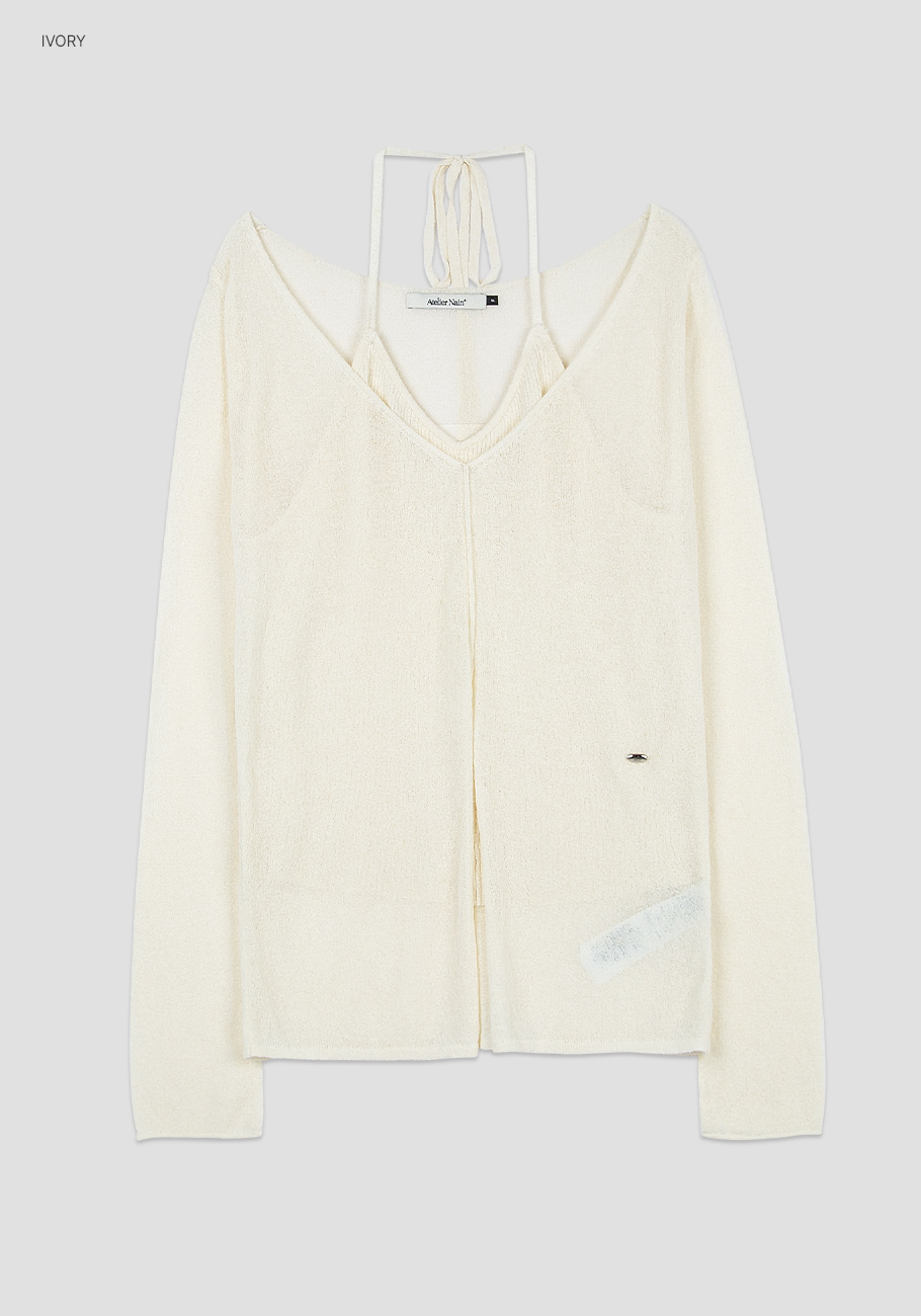 홀터넥 나시탑과 깊은 브이넥 풀오버가 레이어드된 디자인으로,