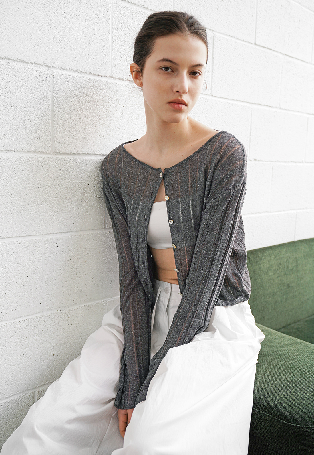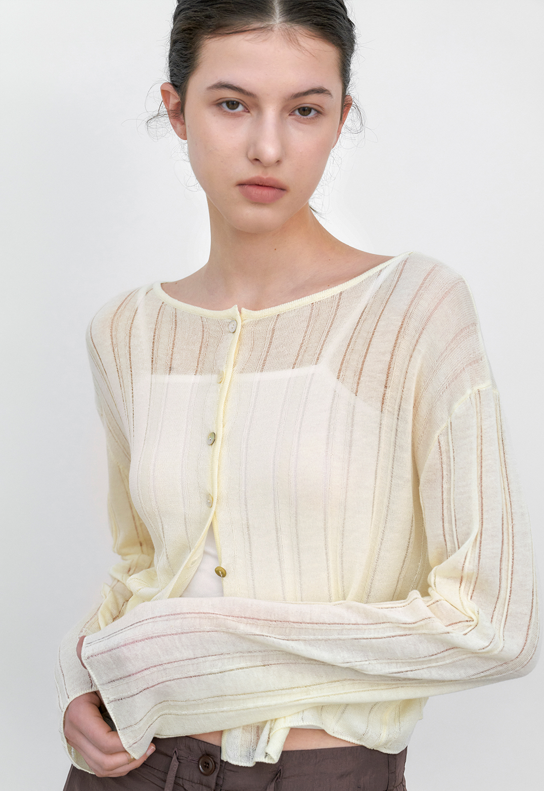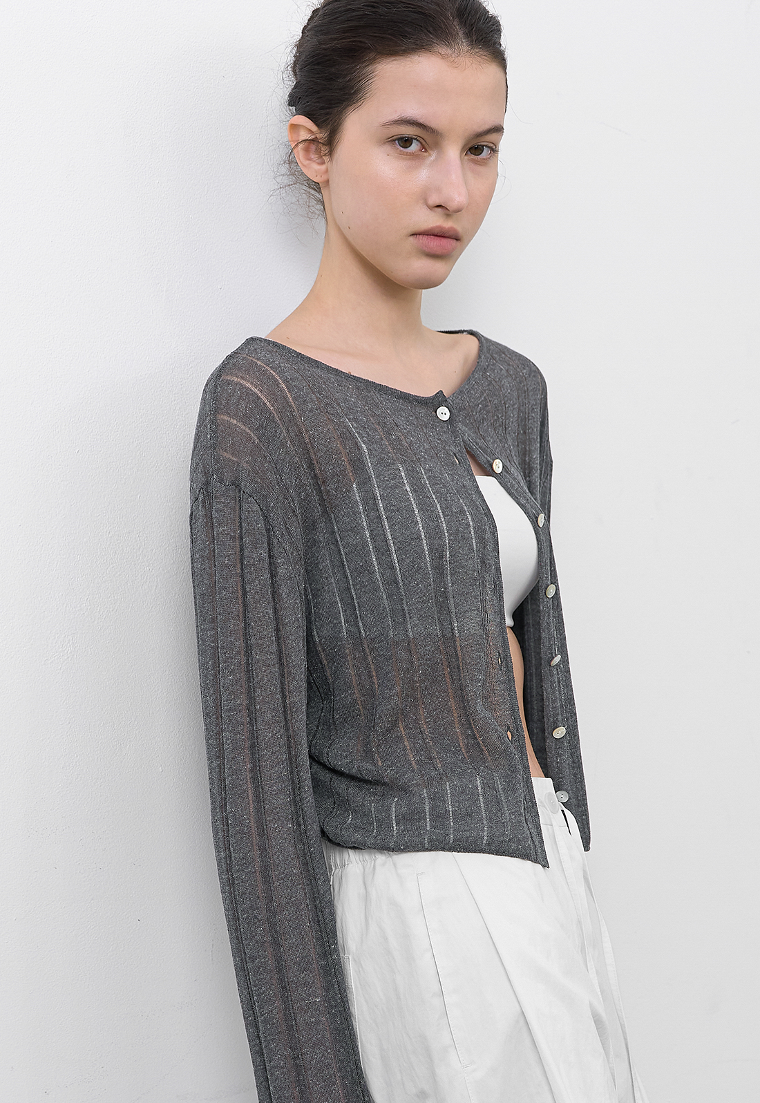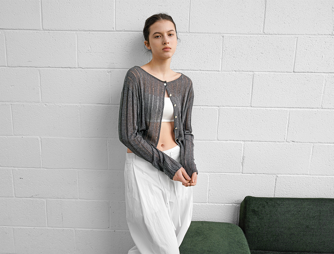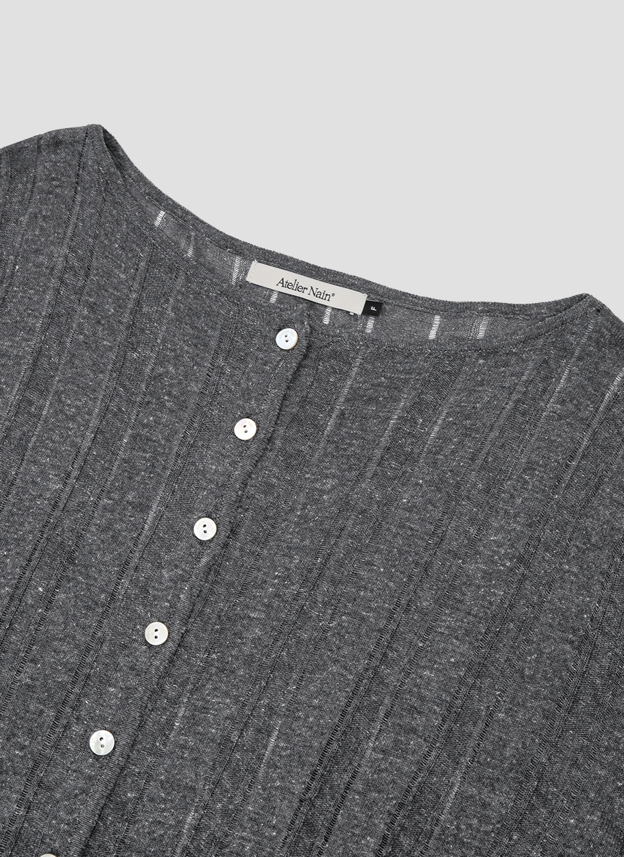 LINEN 혼방 소재의 스카시 조직 니트 가디건입니다.