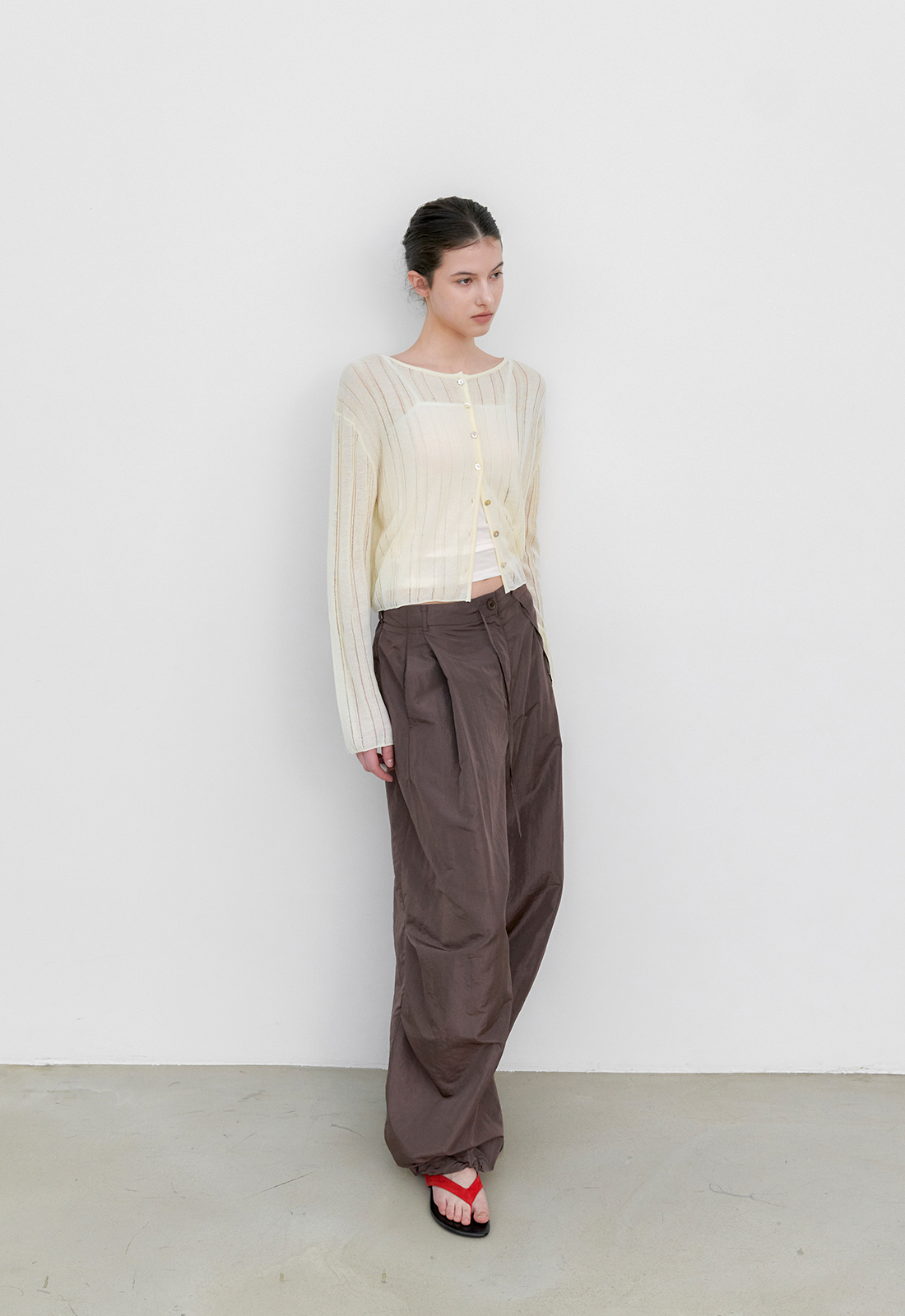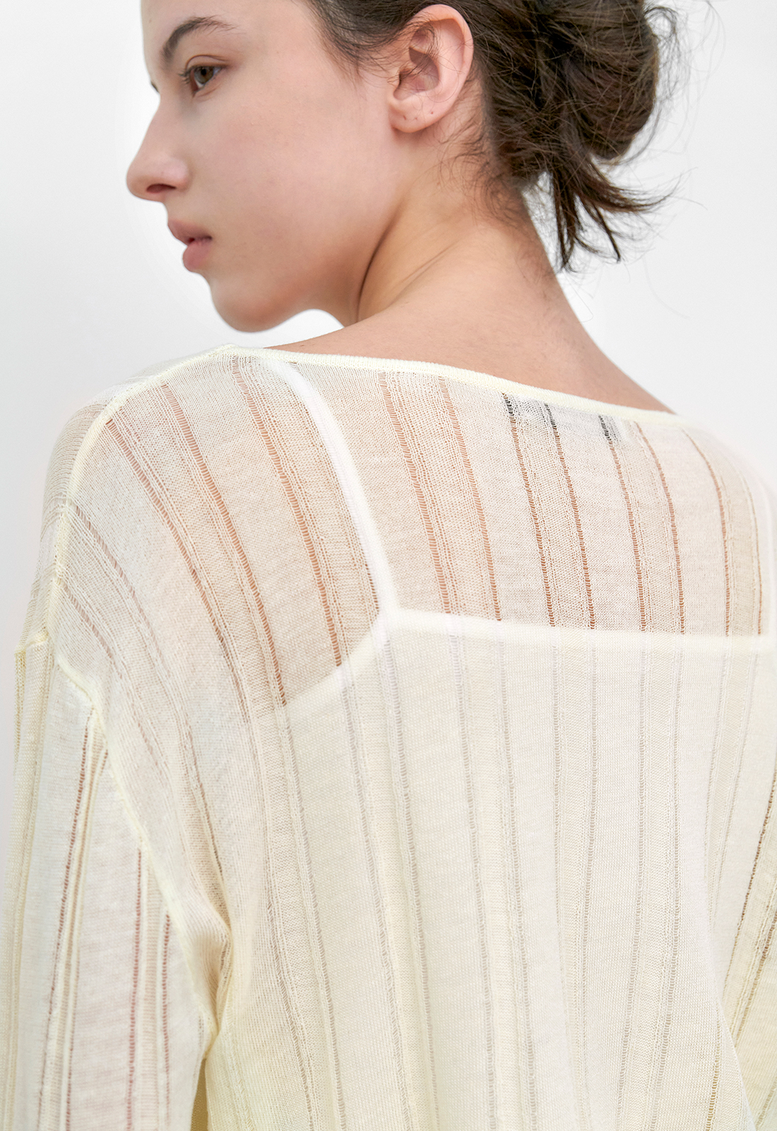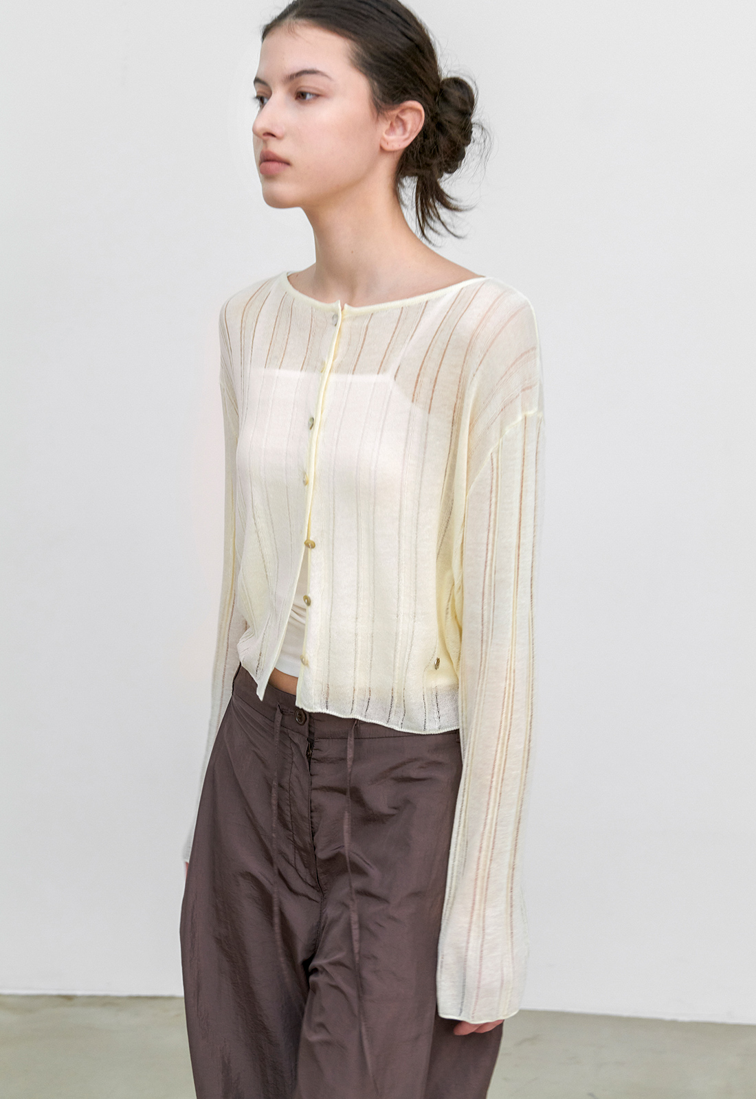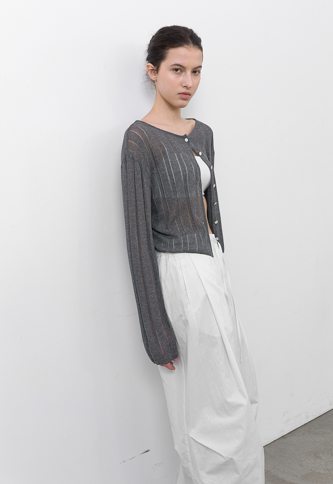 LINEN 혼방 소재의 스카시 조직 니트 가디건입니다.