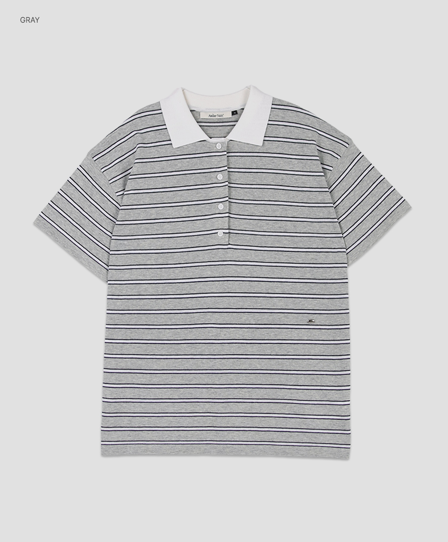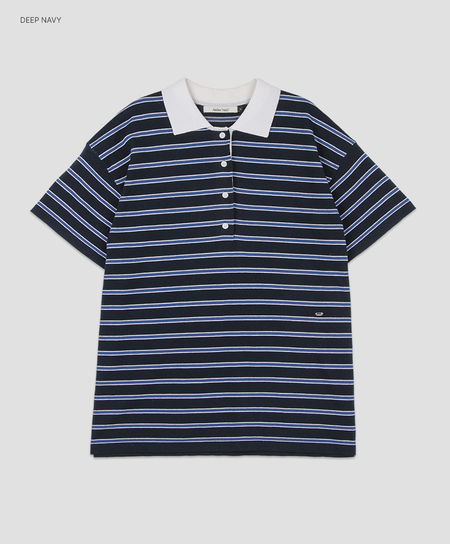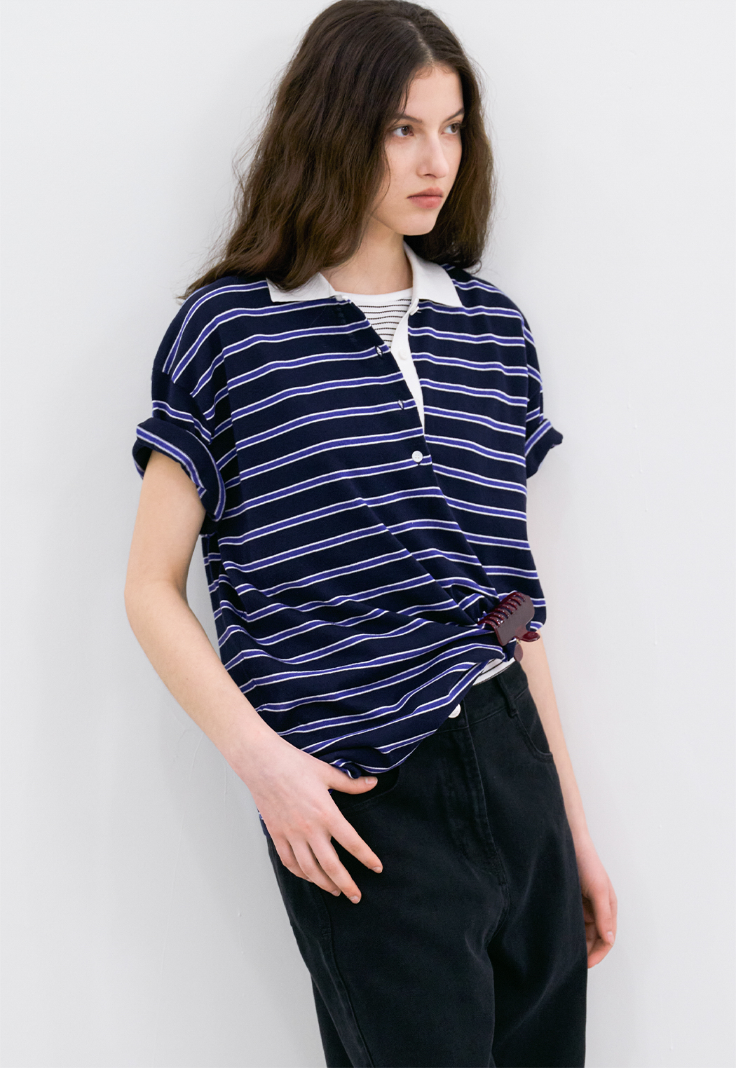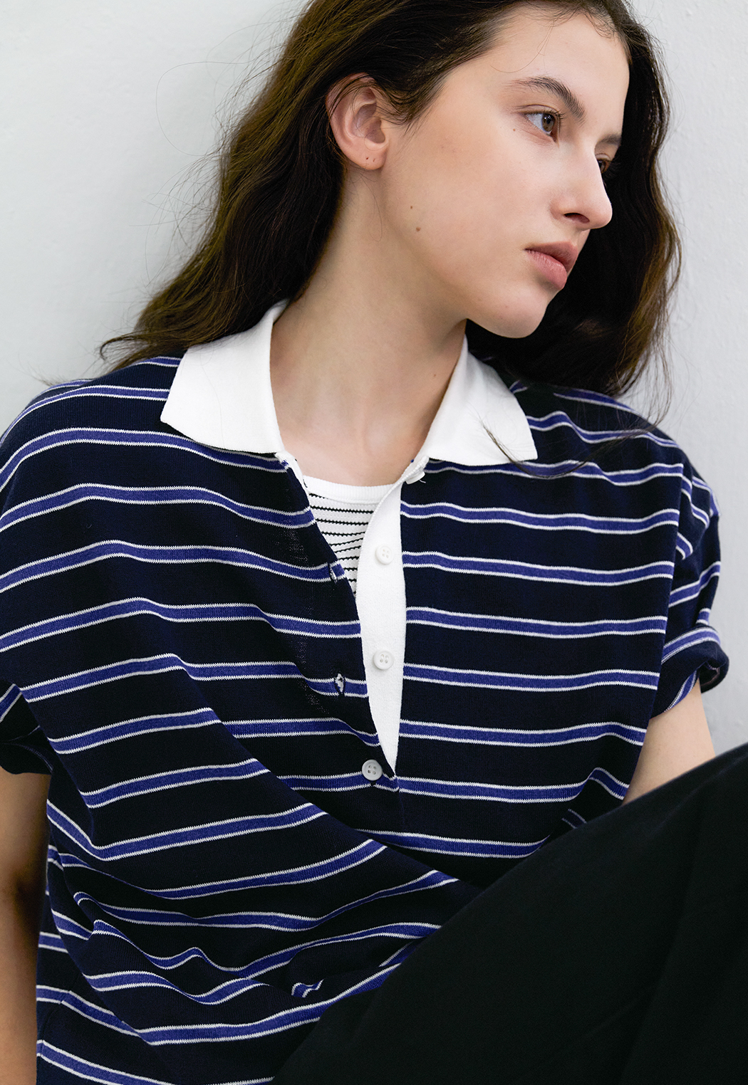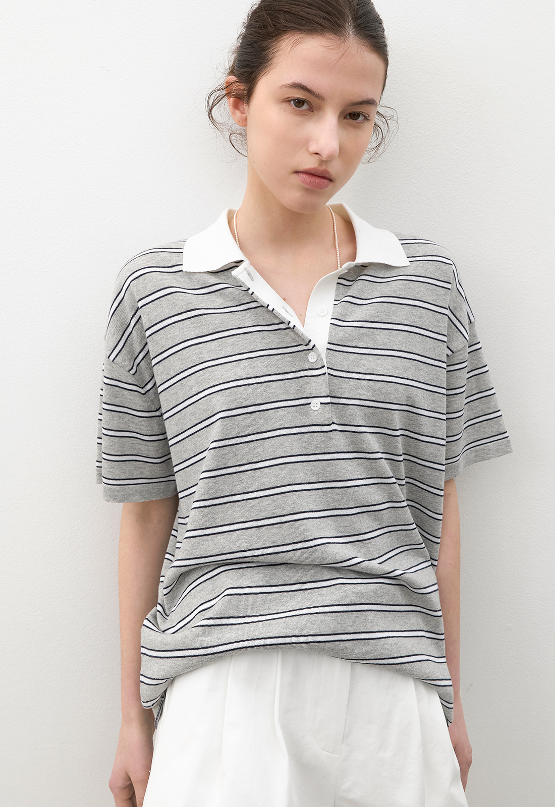 루즈 핏의 스트라이프 폴로 니트 풀오버입니다.