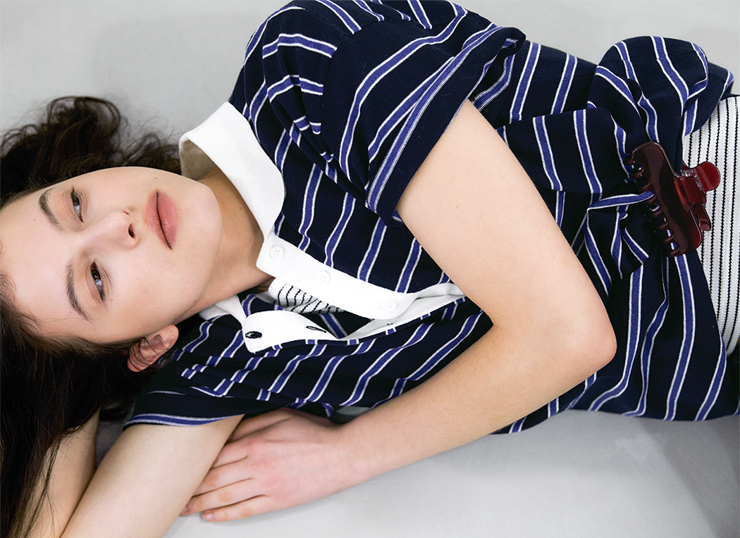 화이트 배색 칼라가 얼굴을 화사하게 밝혀주며,