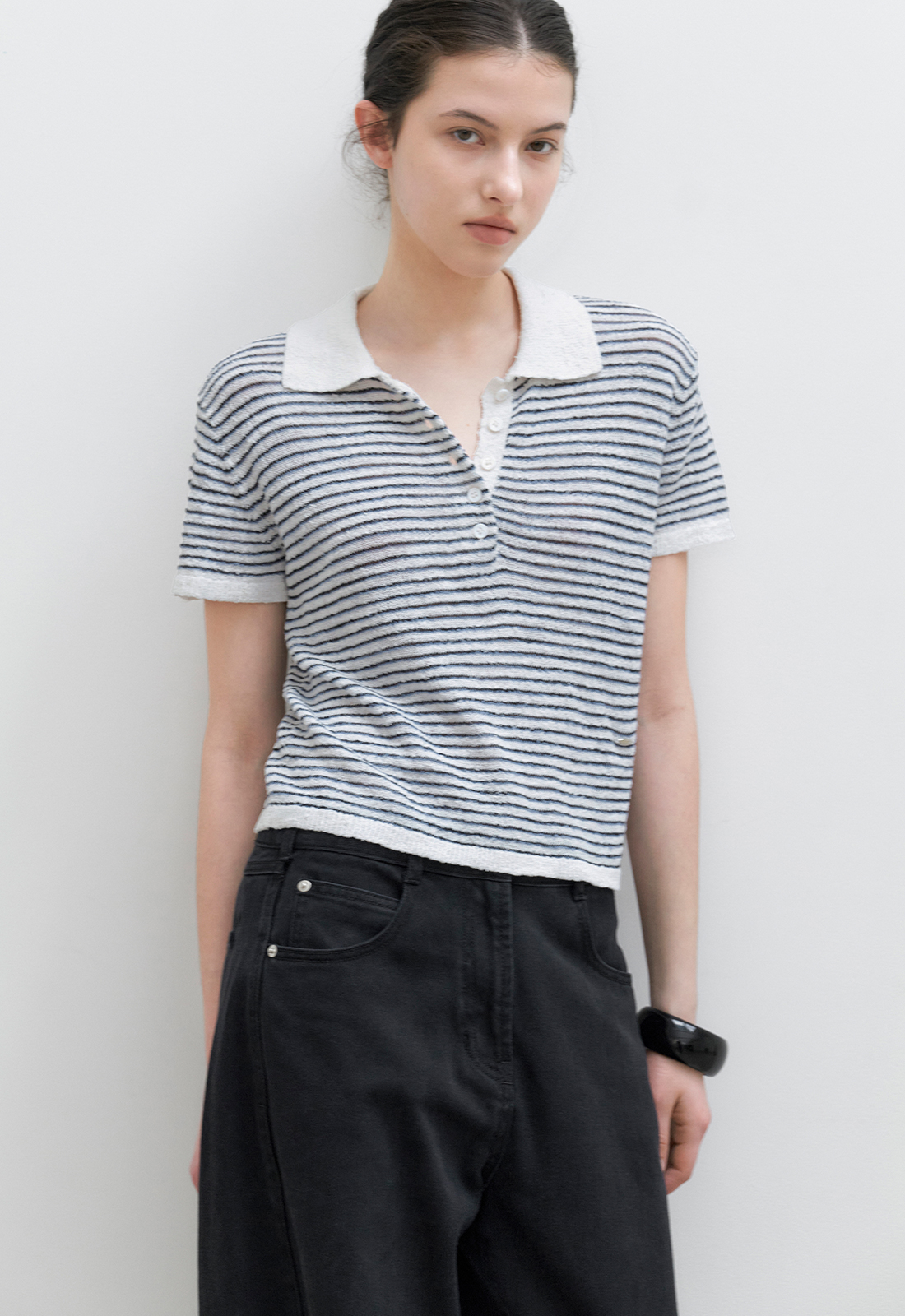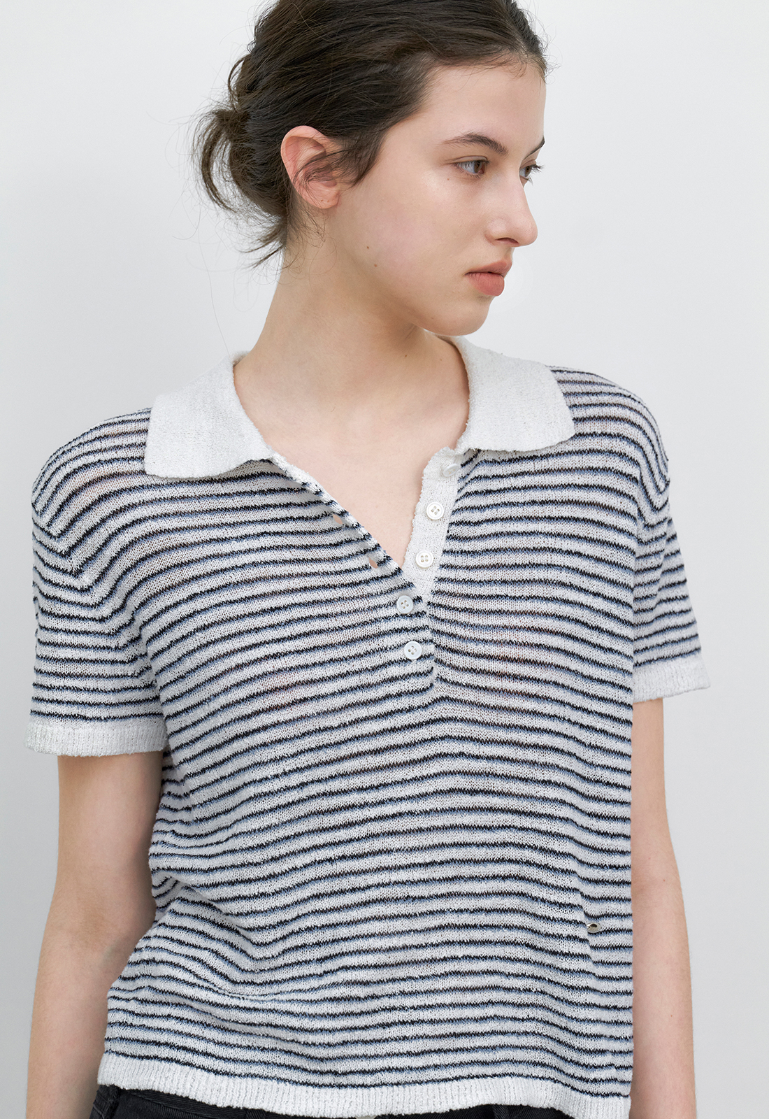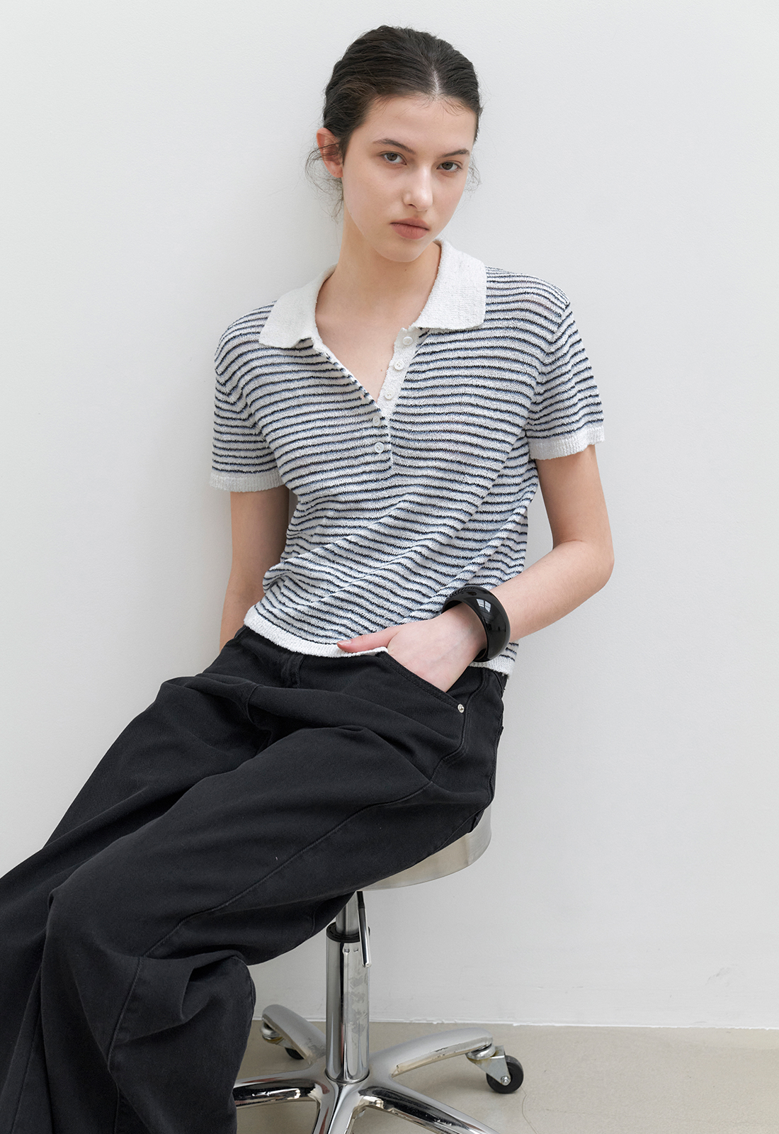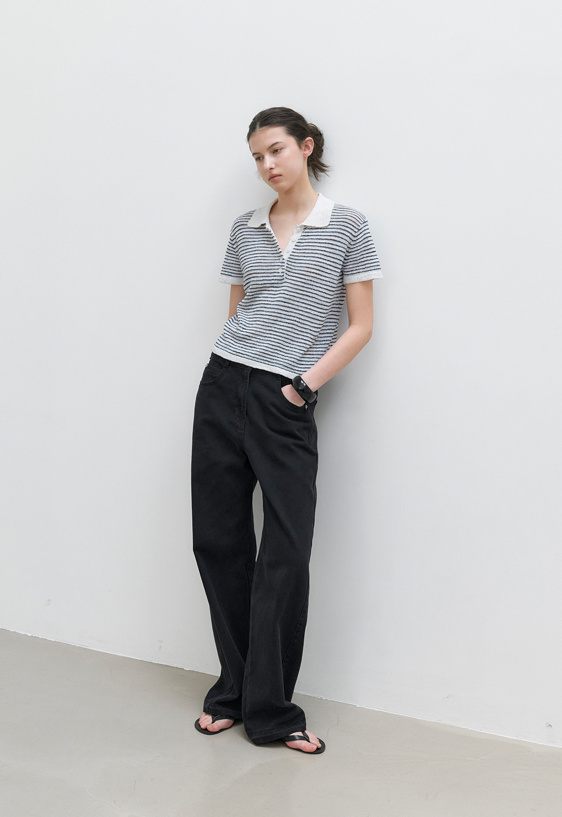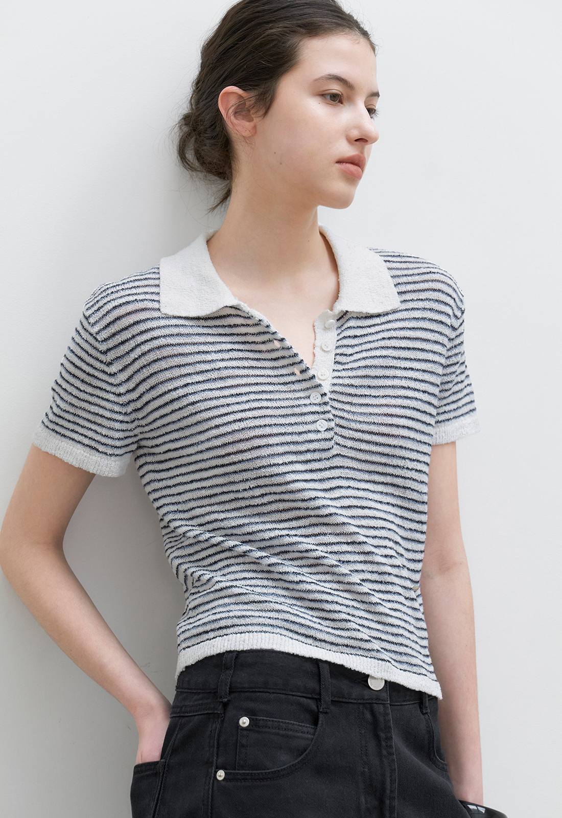 얇은 3도 스트라이프가 캐주얼한 무드를 연출하며,