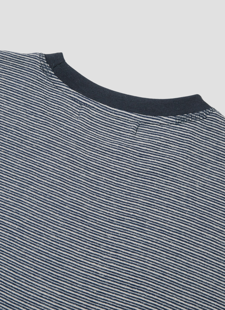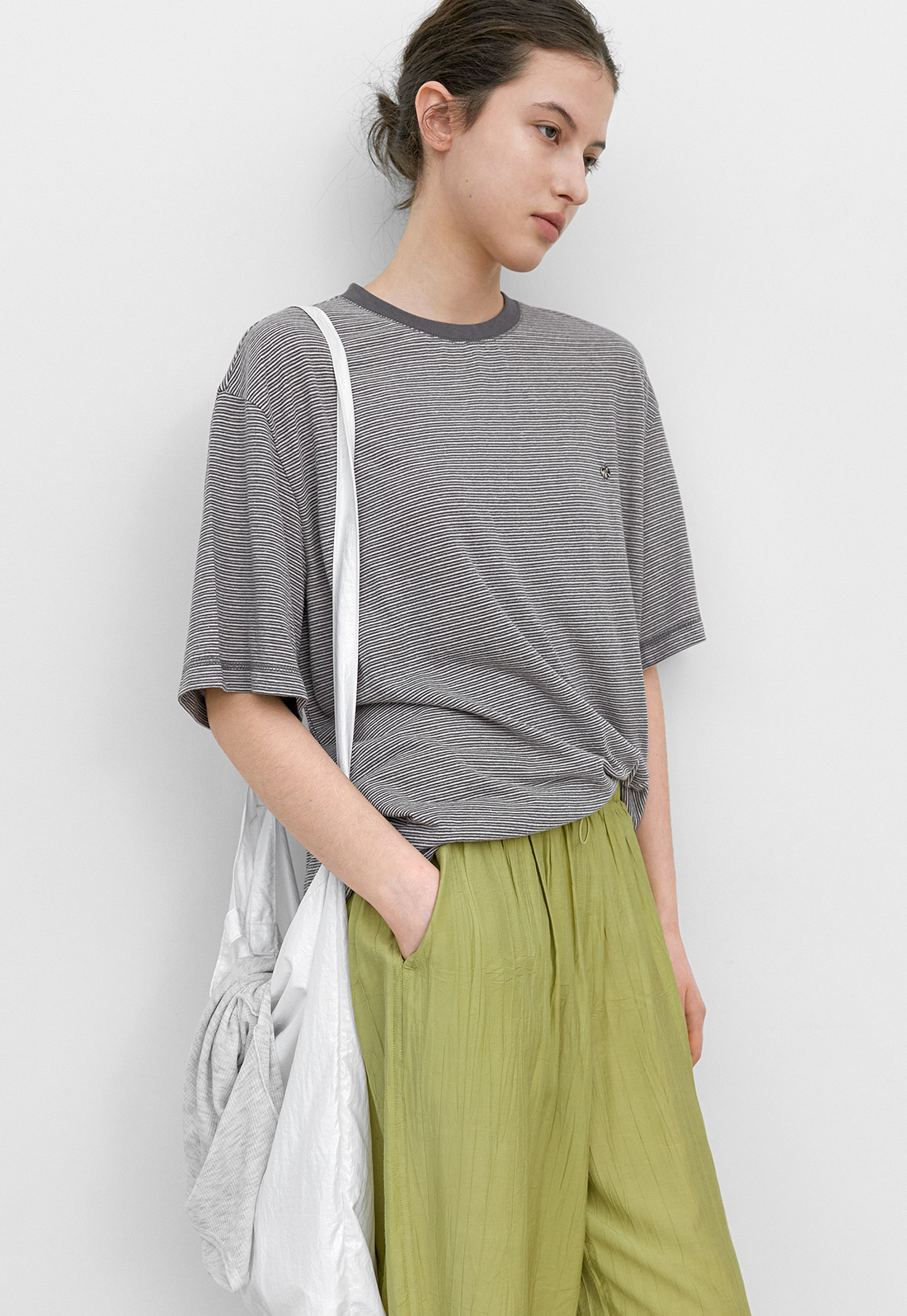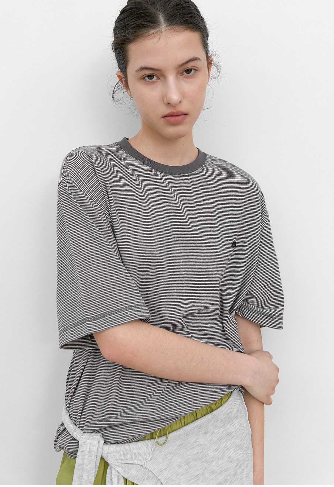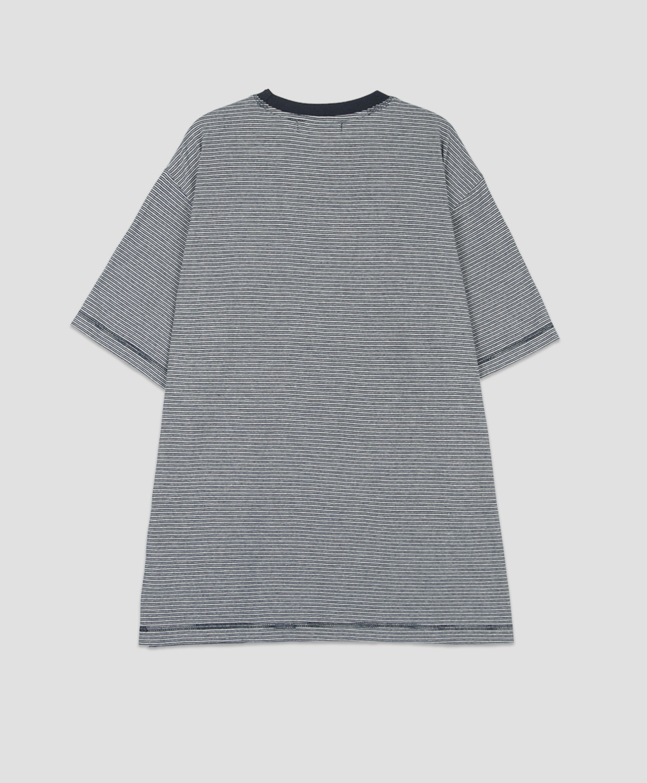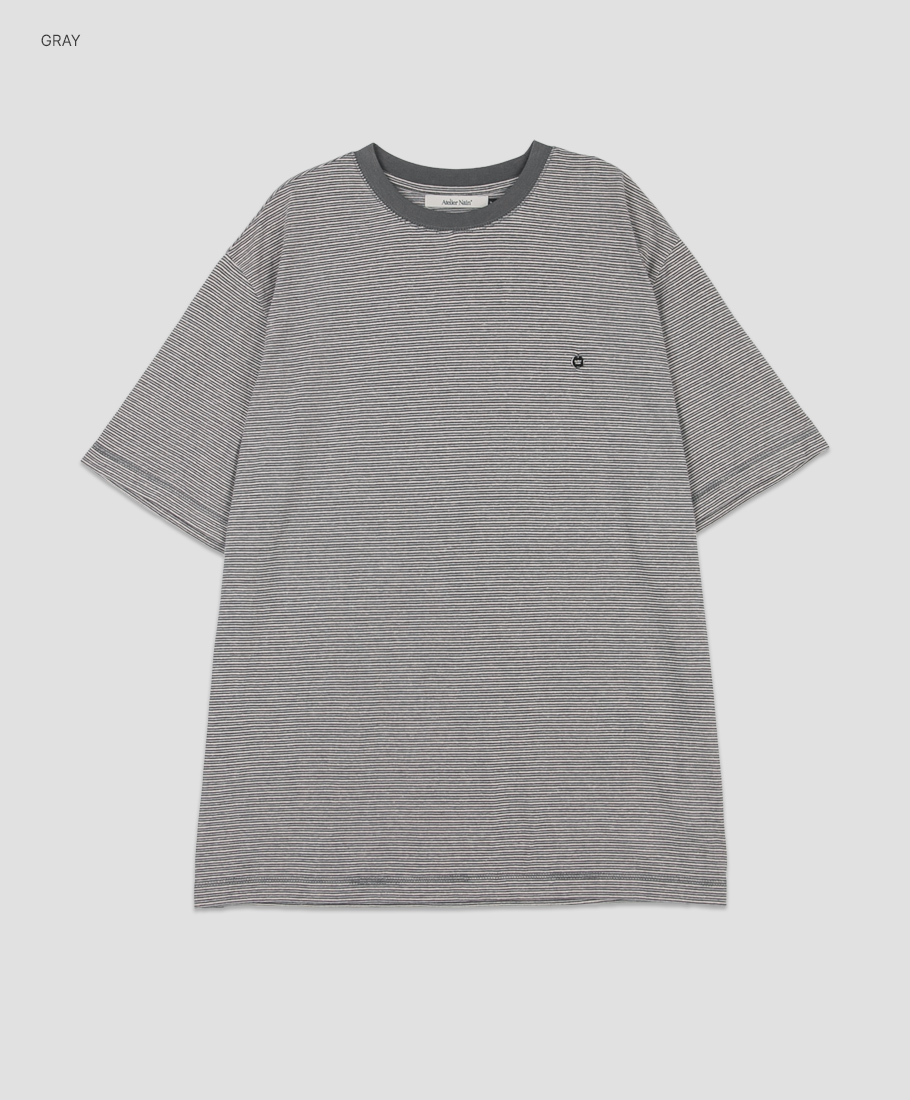 멀티 스트라이프와 배색 리브 디테일이 포인트인 박시핏 티셔츠입니다.