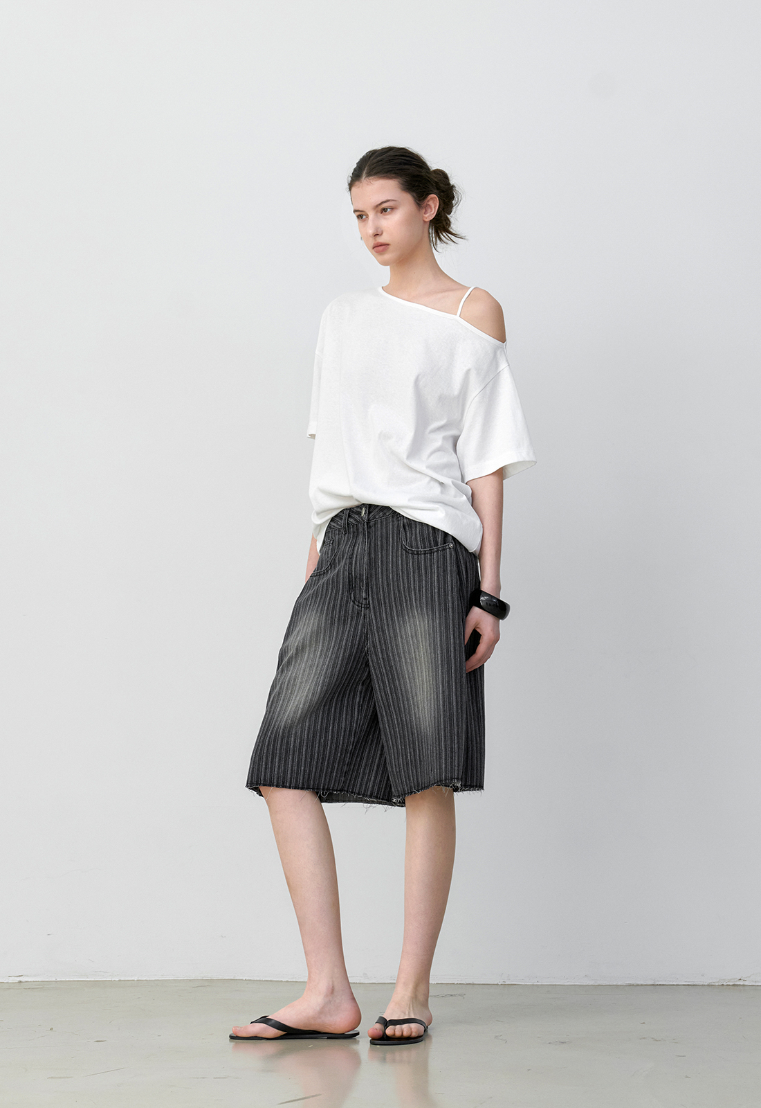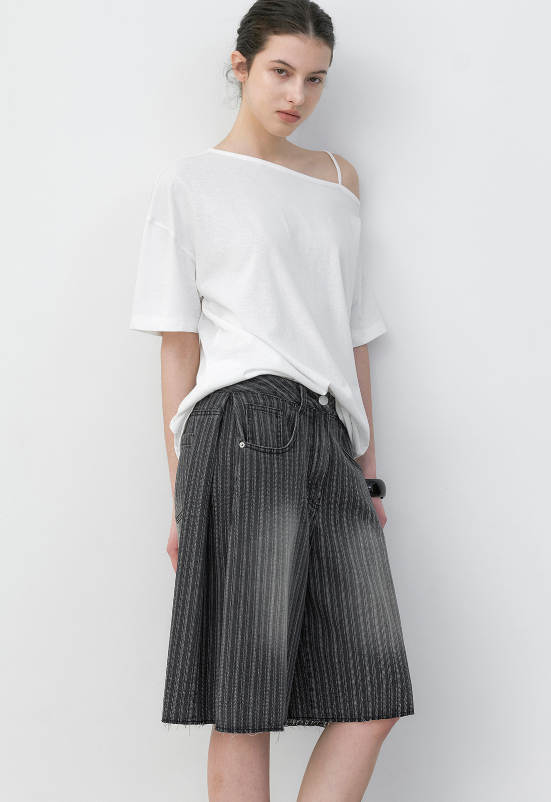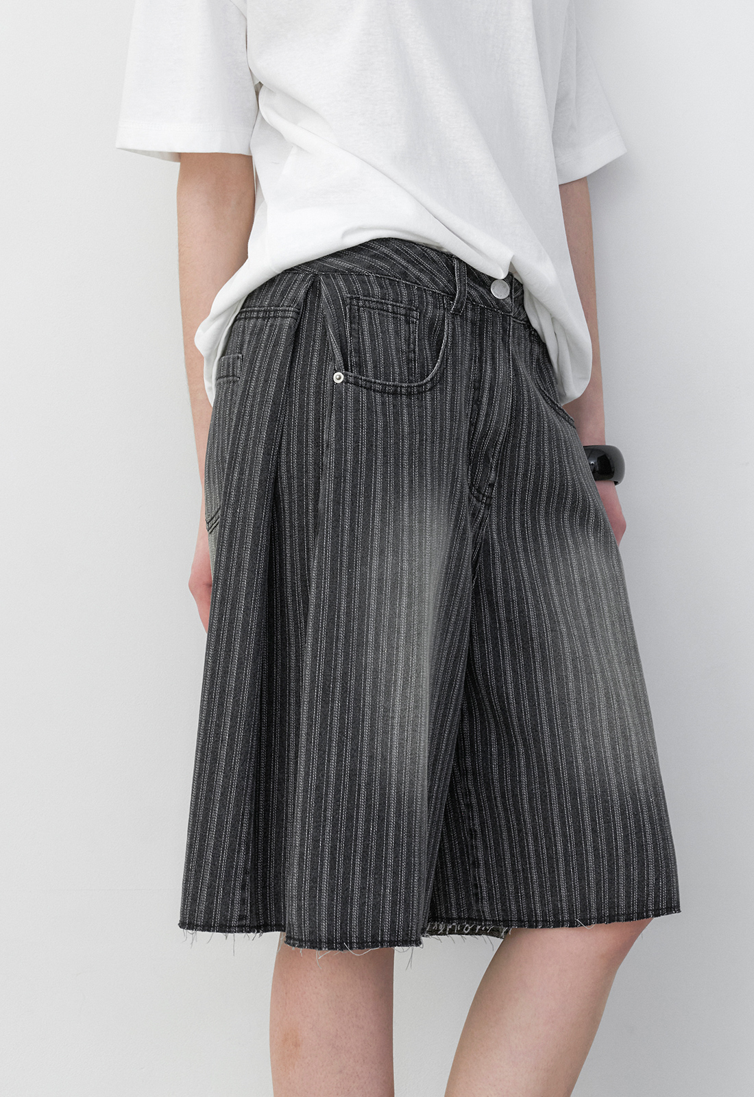 (PT-5769) Tuck Curved Stripe Denim Pants의 버뮤다 버전으로,