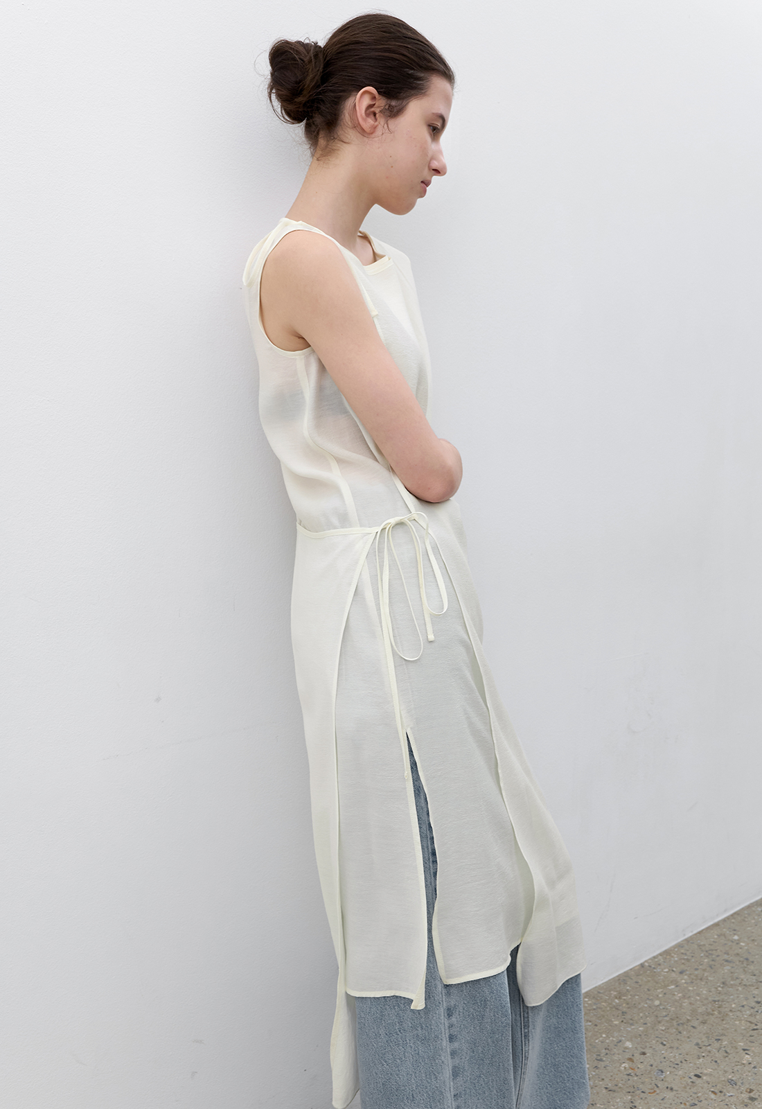 레이어드 디테일과 시어 소재의 투명감이 매력적인 스트랩 드레스입니다.