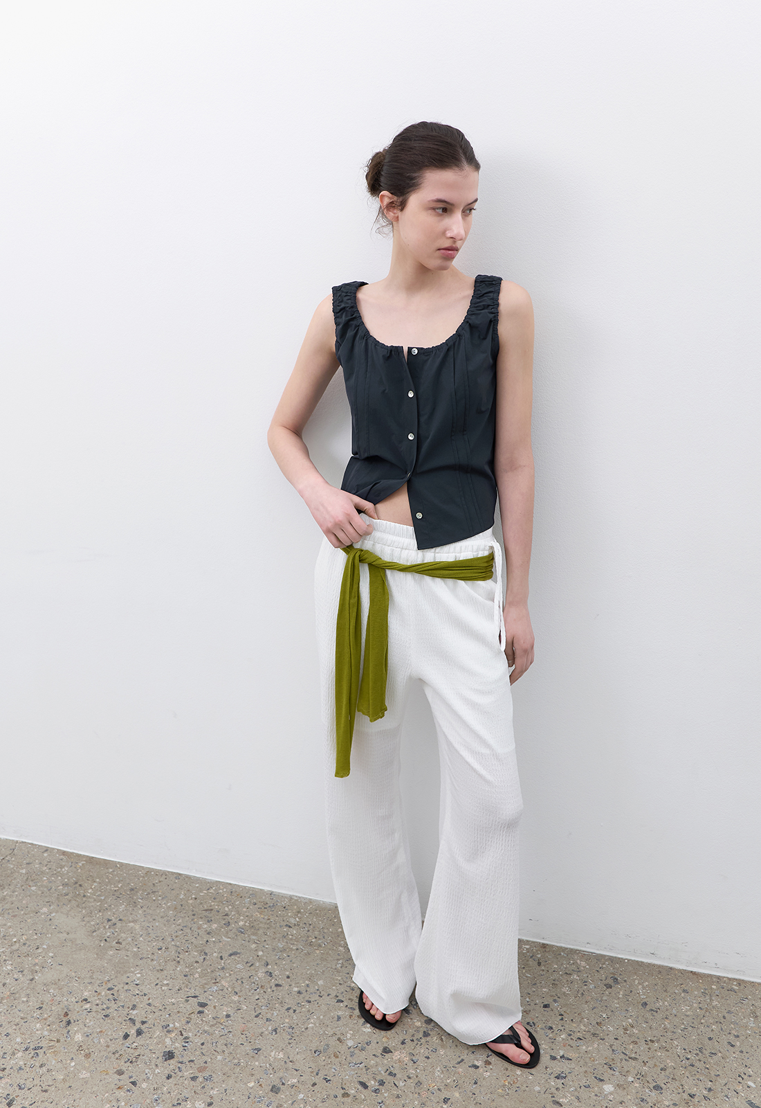 자연스러운 셔링과 핀턱 디테일로 부담 없는 실루엣과 보헤미안 감성을 더했으며,