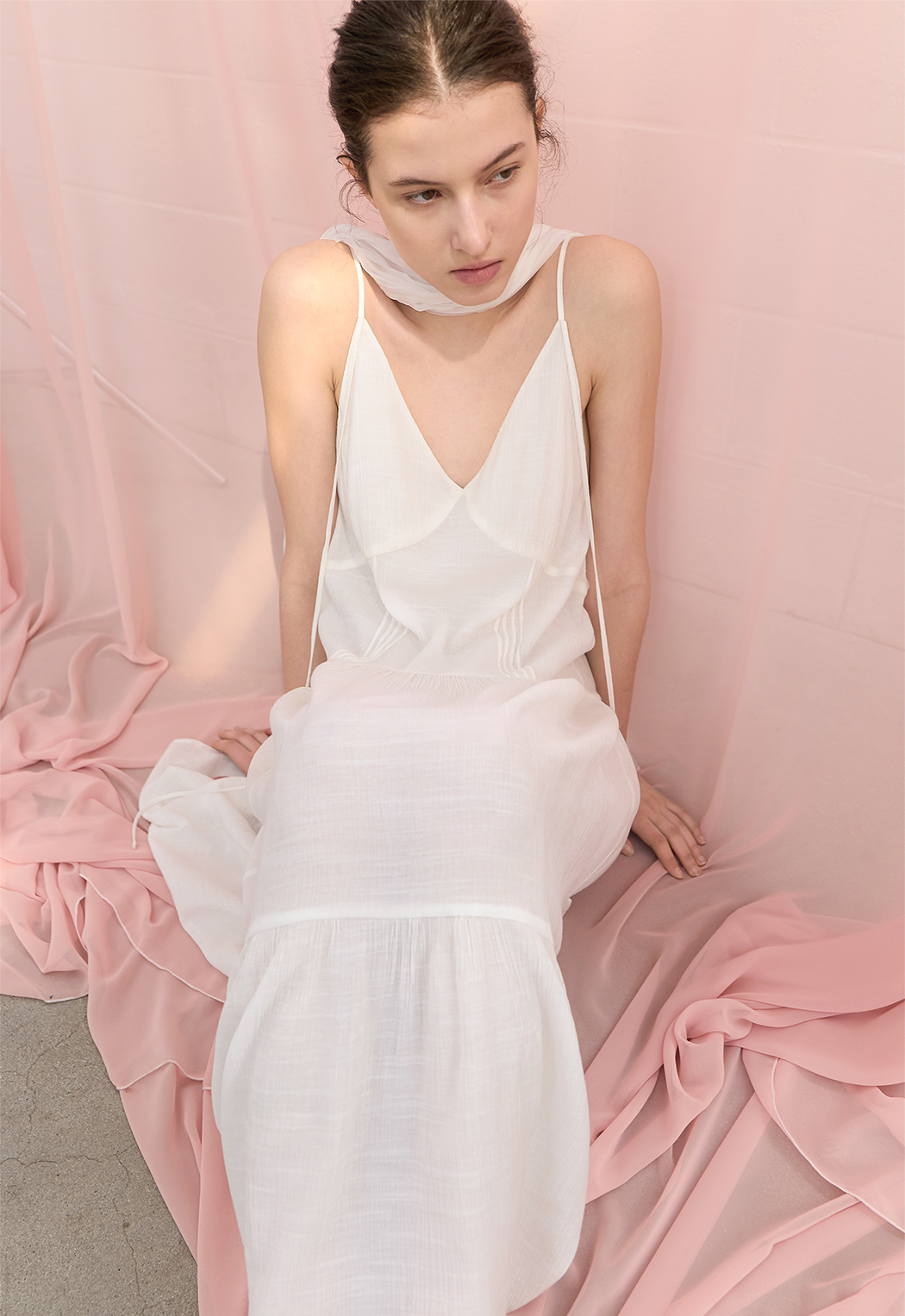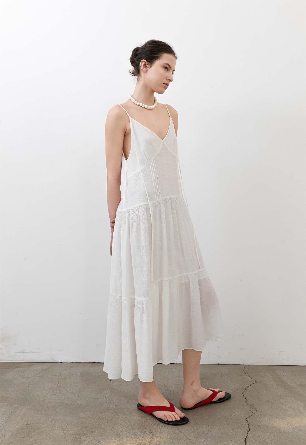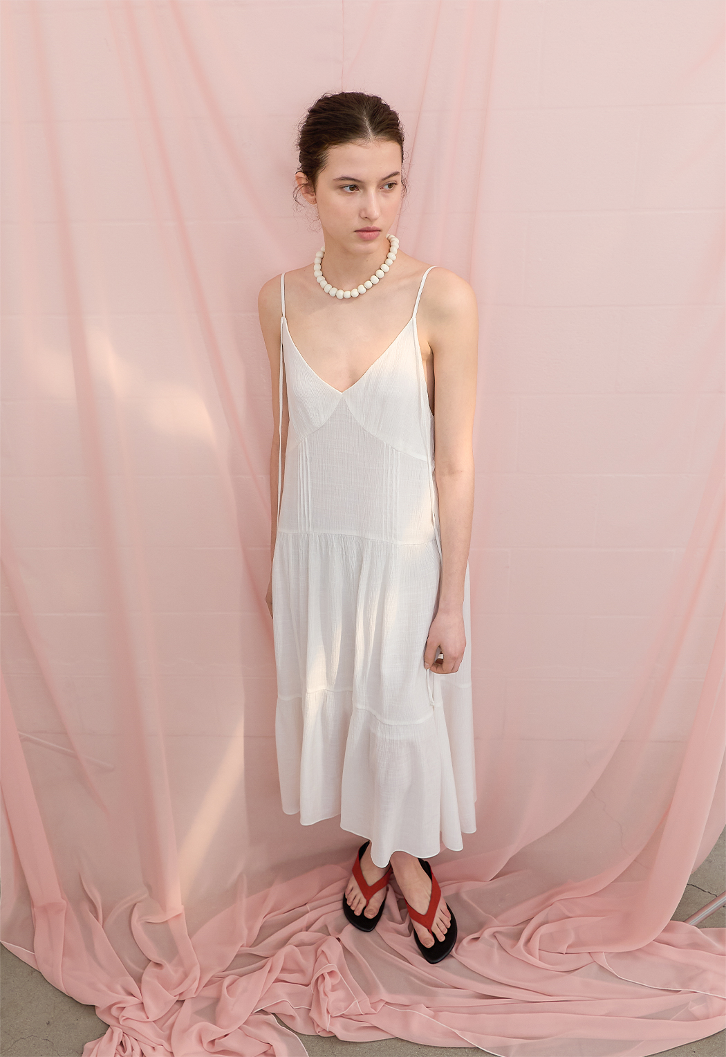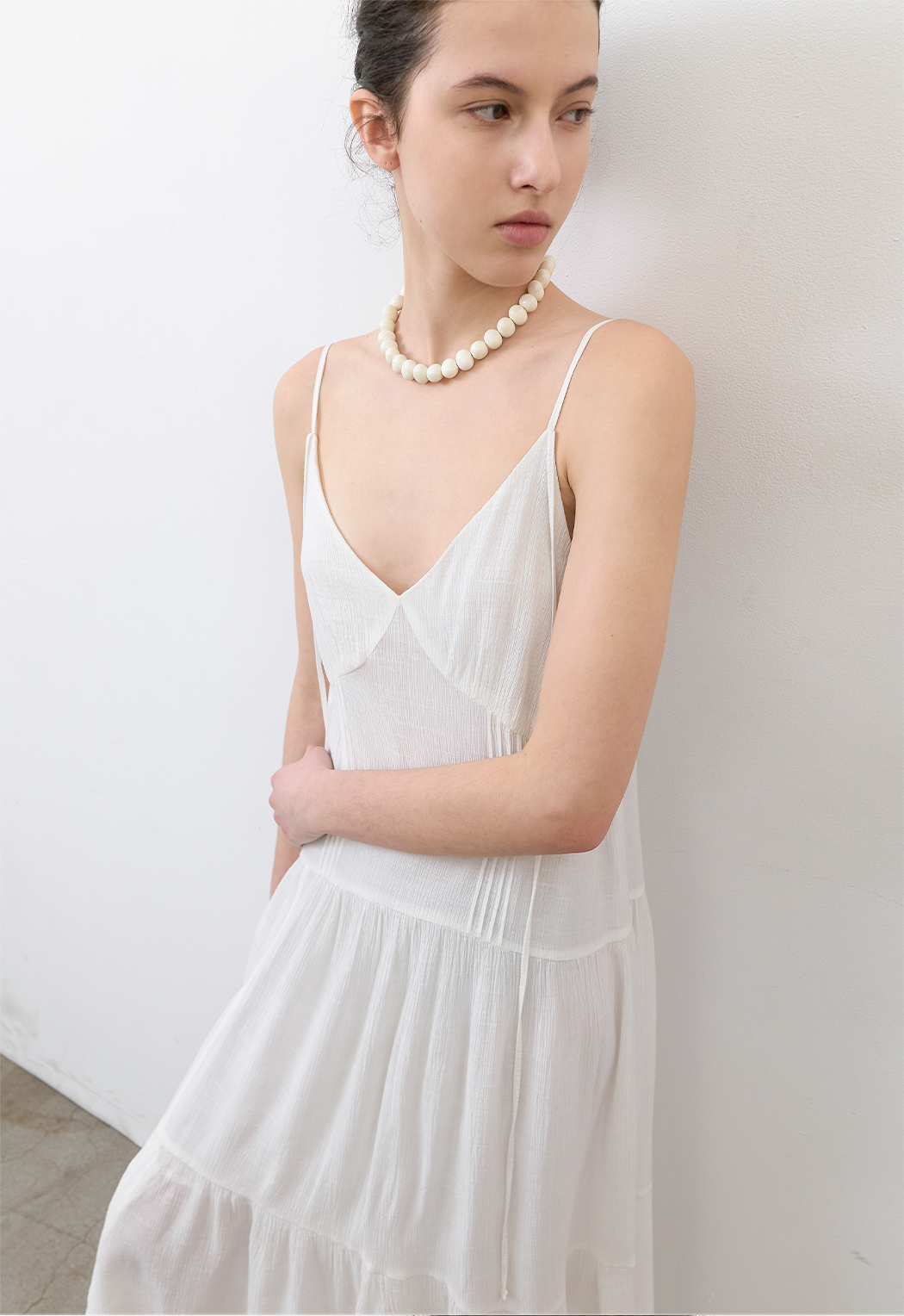 은은한 결감의 소재와 여유로운 실루엣, 티어드 디테일이 어우러져