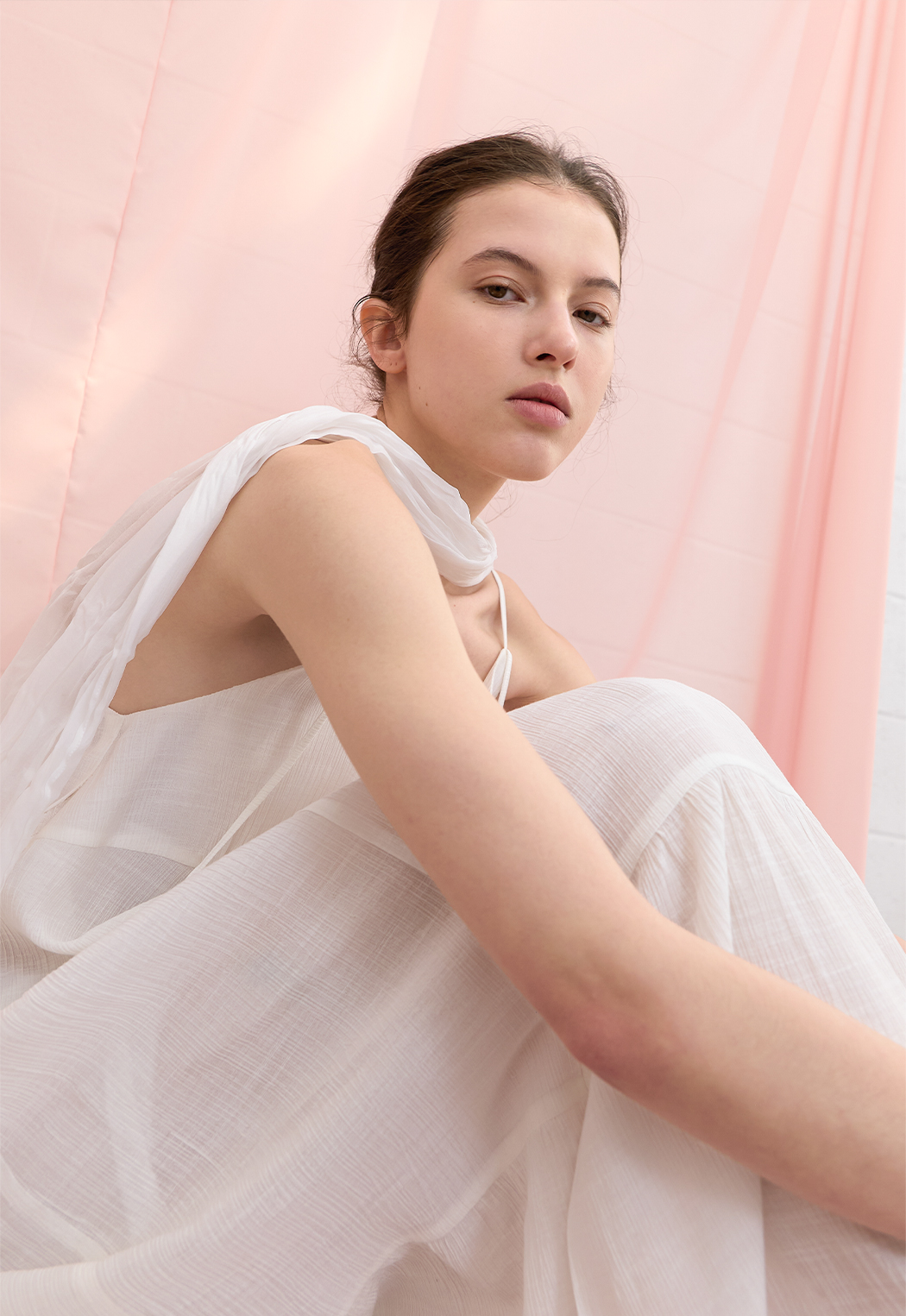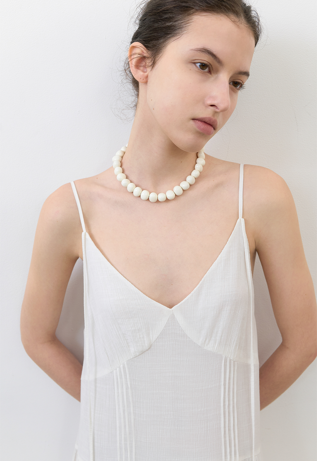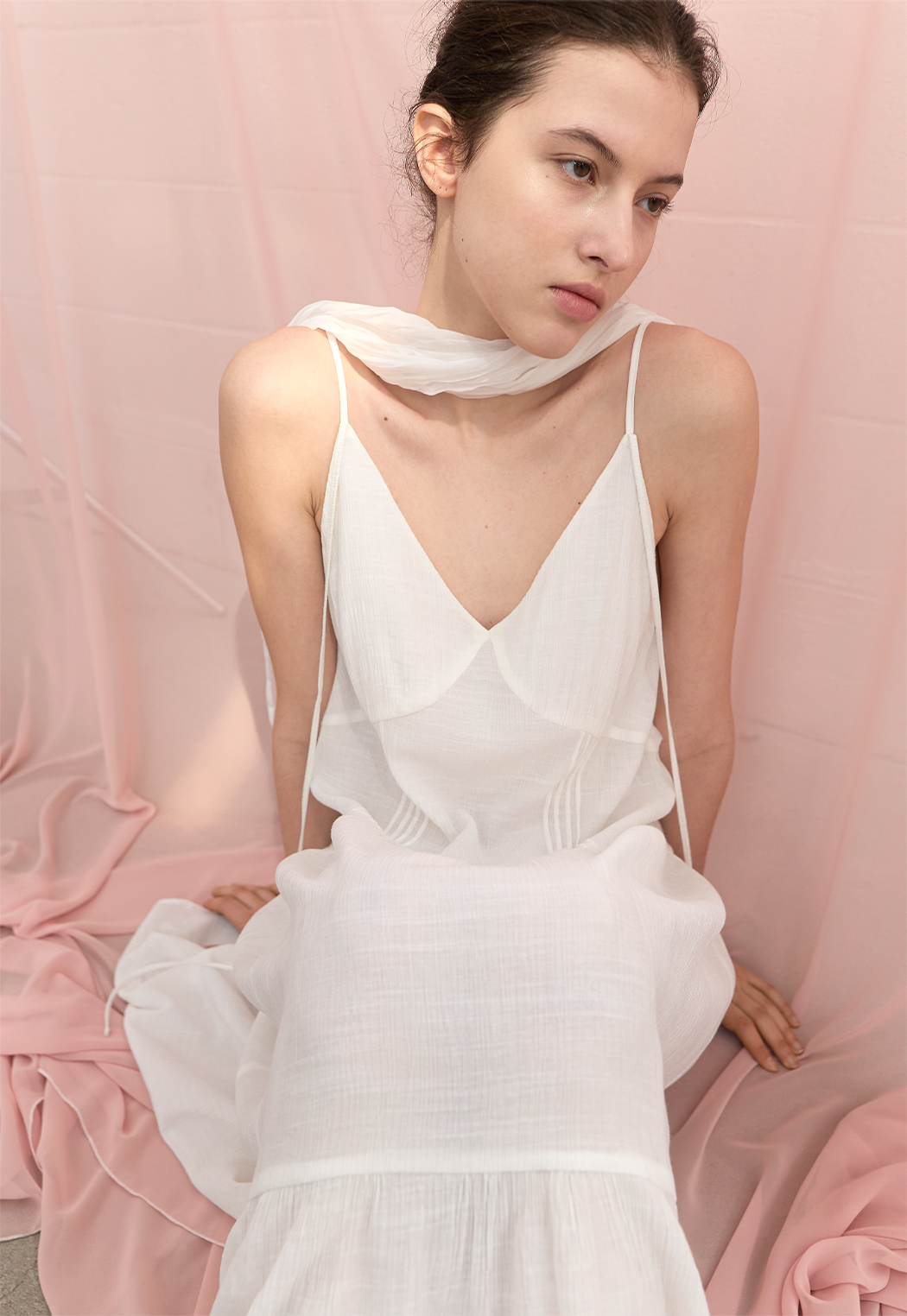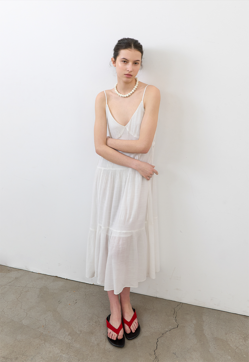 은은한 결감의 소재와 여유로운 실루엣, 티어드 디테일이 어우러져